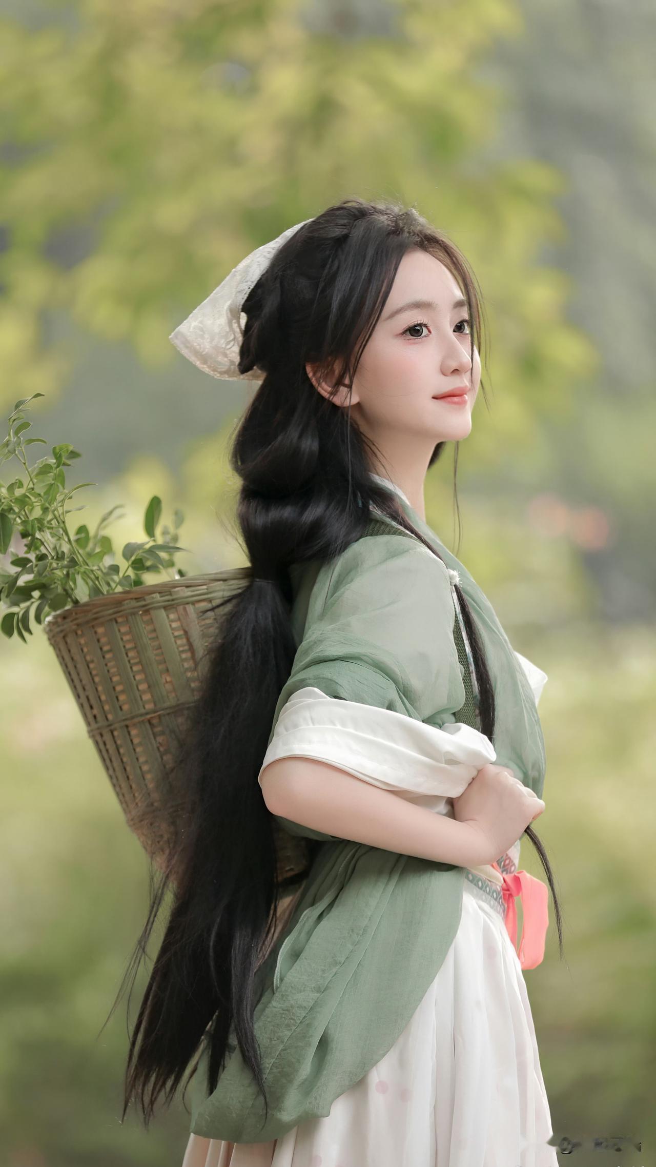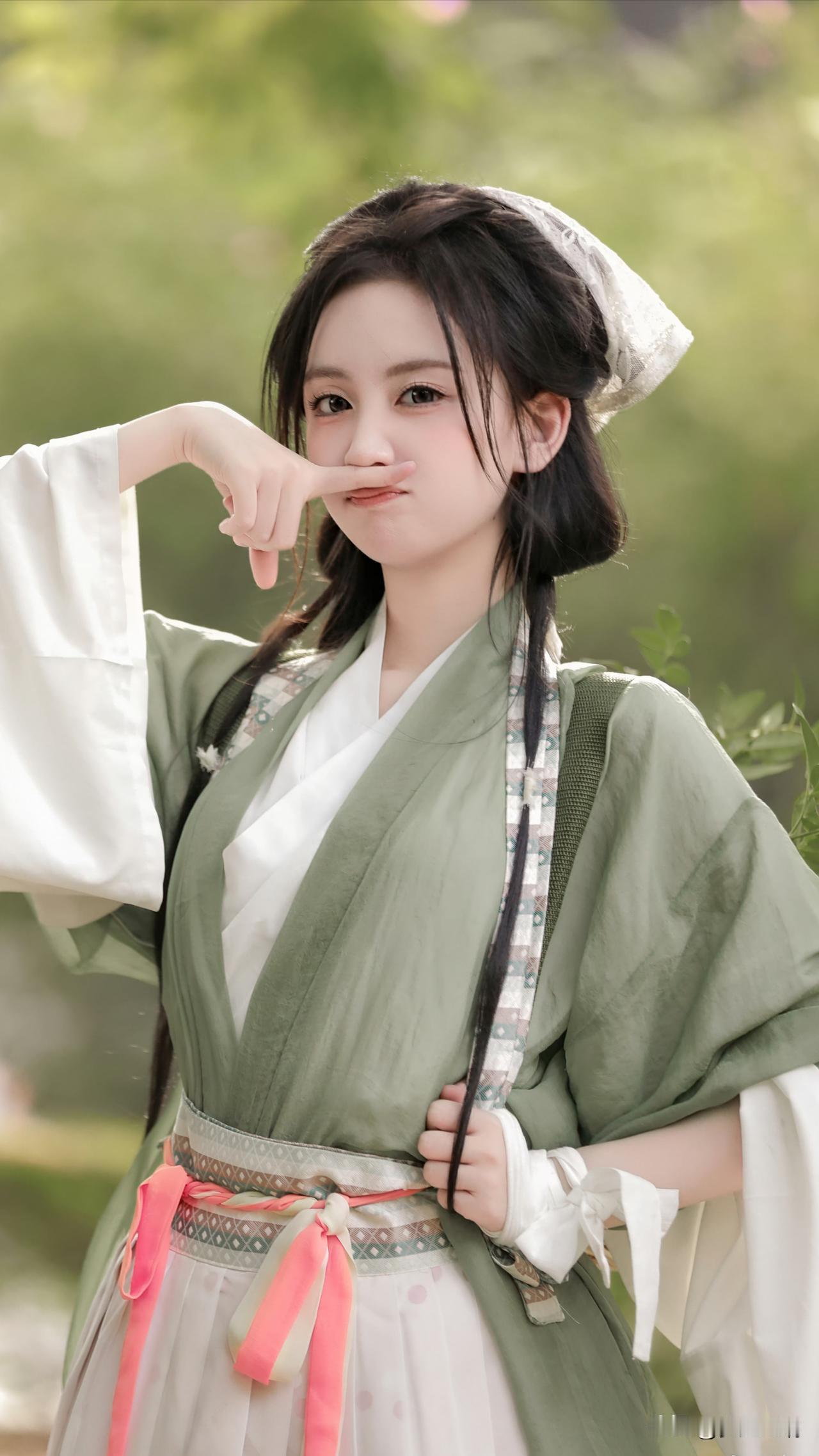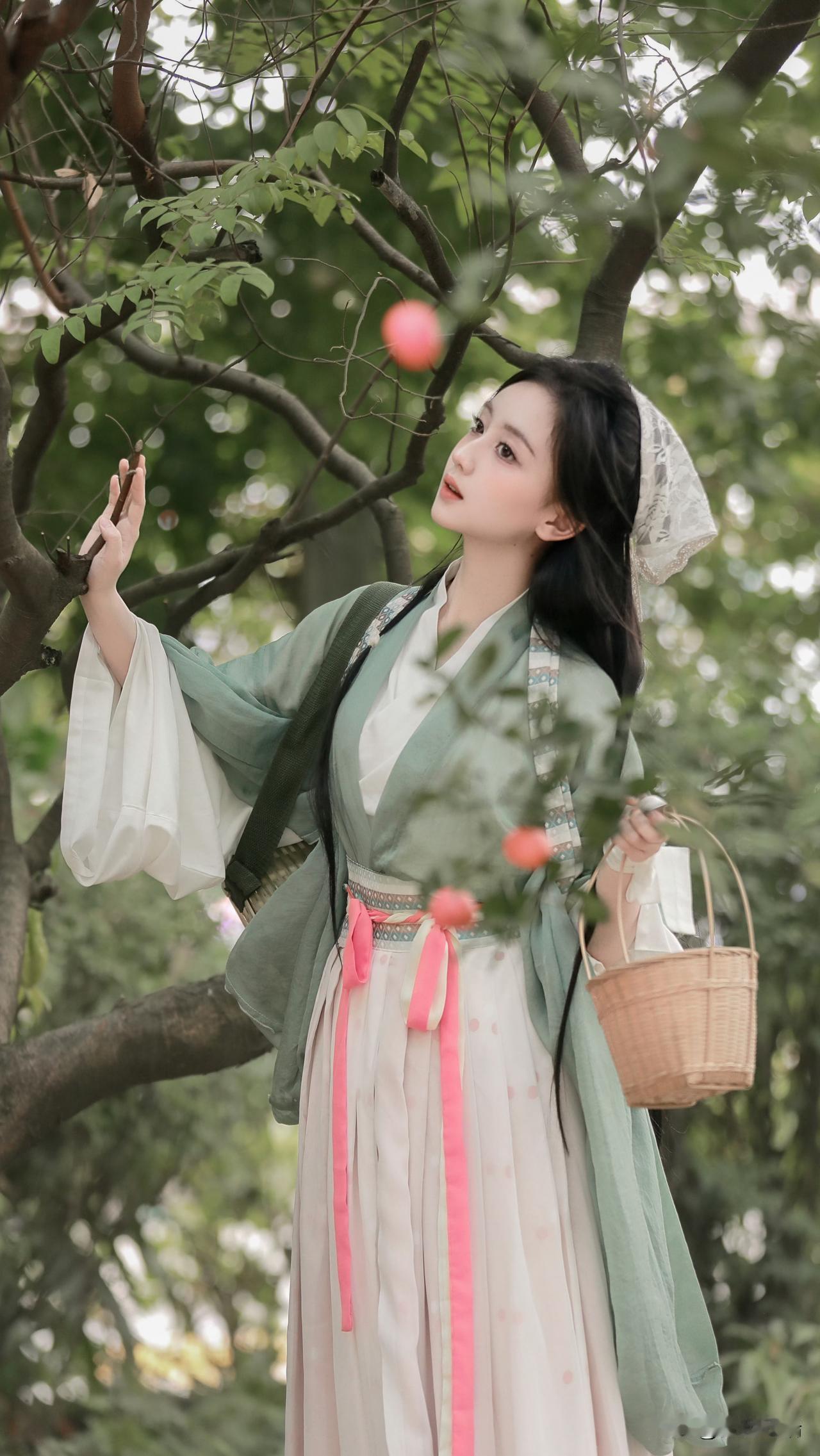 绿衣少女在花丛中,手拿白帕,清新自然,宛如古代仕女图。