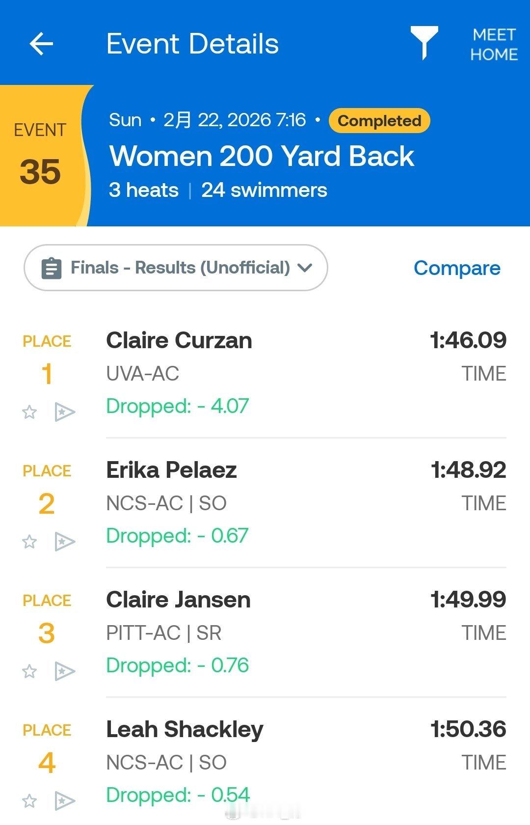 ACC Championships 女子200码仰泳,Claire Curzan 1:46.09打破自己保持的NCAA和全美纪录!