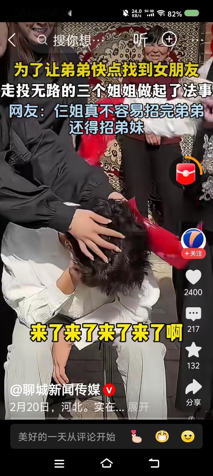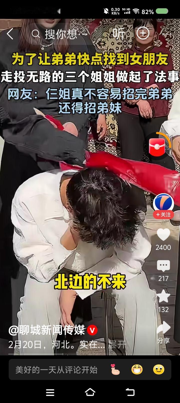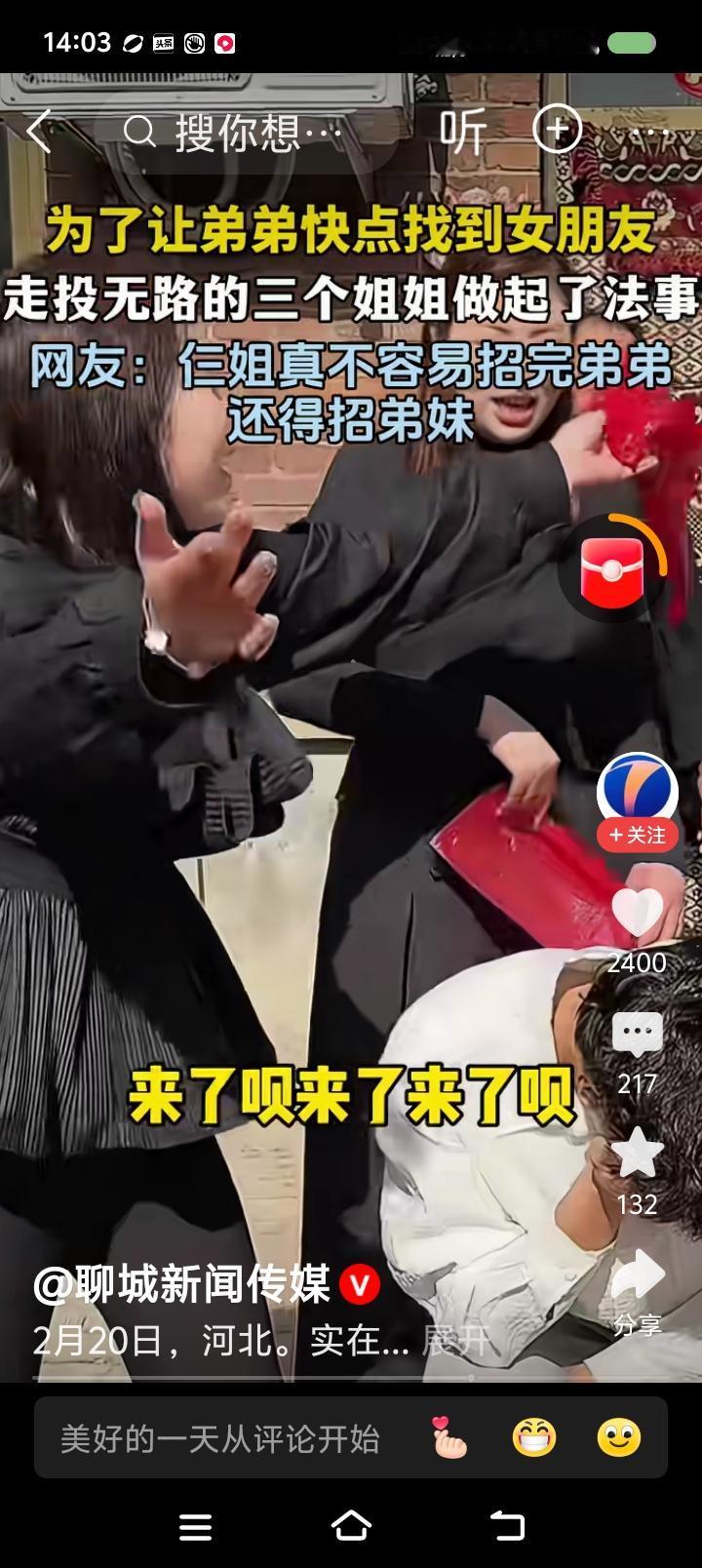 “法事”招亲要不得!—— 据报道,为了让弟弟找到女朋友,几个姐姐做起了“法事”:“桃花开杏花来,弟弟的对象赶紧来。男的不来女的来,北边的不来南边来……” 点评: 此行为虽有玩笑成分,仍不可取。与其“法事”招亲,不如“法式”招人:三观确立,工作积极,多与社会接触。怎么会找不到?