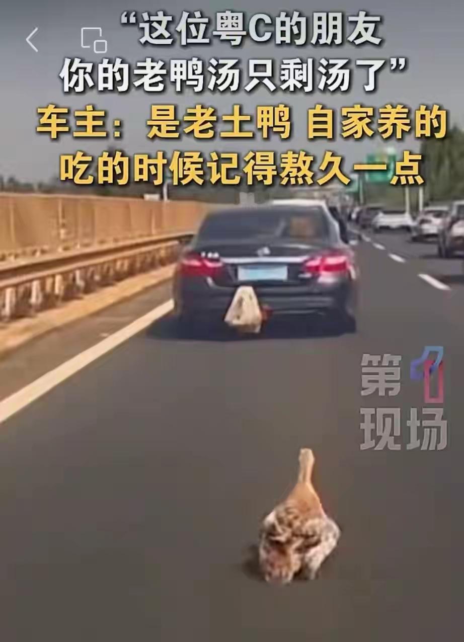 笑不活了! 粤C车主高速上把鸭子“丢”了,全网都在帮它找主人! 第一批返程大军堵在路上,广西高速却上演了一出现实版“鸭子大逃亡”。 车主怕后备箱闷坏活鸭,挂在外面没绑牢,一不留神就让它溜了。 鸭子在车流里摇摇晃晃“散步”,又好笑又让人捏把汗。 网友喊话太逗:你的老鸭汤只剩汤了!没想到车主很快现身认领, 这只土鸭还是要带给家人的心意,闹了个大乌龙。 其实笑归笑,返程路上真的要留心。东西没固定好, 掉下来就是大隐患,别让暖心年货变成路上麻烦。