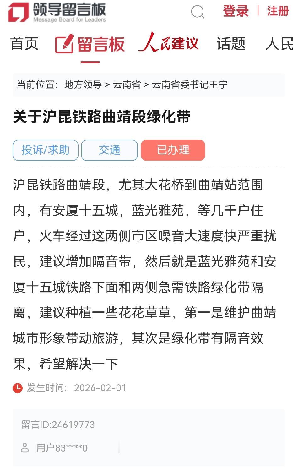 曲靖网民向云南省委书记反映关于沪昆铁路曲靖段绿化带建设 ✍📩2月1日云南曲靖网民通过人民网领导留言板给省委书记留言反映: ▶️关于沪昆铁路曲靖段绿化带 沪昆铁路曲靖段,尤其大花桥到曲靖站范围内,有安厦十五城,蓝光雅苑,等几千户住户,火车经过这两侧市区噪音大速度快严重扰民,建议增加隔音带,然后就是蓝光雅苑和安厦十五城铁路下面和两侧急需铁路绿化带隔离,建议种植一些花花草草,第一是维护曲靖城市形象带动旅游,其次是绿化带有隔音效果,希望解决一下 发生时间:2026-02-01 回复⏰:2026-02-14 19:00 📢📩曲靖市交通运输局官方回复 网民同志:您好! 您通过人民网领导留言板给云南省委书记的留言收悉,曲靖市交通运输局高度重视,现将有关情况答复如下: 🚄沪昆铁路为国有运营干线,经营管理单位为中国铁路昆明局集团有限公司,隶属于国铁集团,该铁路于2007年建成投运,其噪声控制等相关指标均已通过国家验收,您反映的小区建于2015年,属于先有铁路、后建小区的情形,由于目前缺少相应投资主体,铁路部门暂无加装隔音设施的计划。 🚝根据《铁路安全管理条例》及铁路安全技术规范,铁路线路安全保护区内对建筑物、构筑物建设及植物种植均有严格限制,核心目的是保障列车运行安全。因此,安全保护区内禁止种植高大乔木,以免影响行车安全,而低矮灌木丛对噪声的阻隔效果十分有限,难以达到隔音目的。 针对目前存在的货物列车机电声和铁轮与钢轨的摩擦声,现阶段的技术水平难以完全消除。 感谢您对我市交通运输工作的支持和理解。祝您身体健康,生活愉快! 曲靖市交通运输局 2026年2月13日 高铁