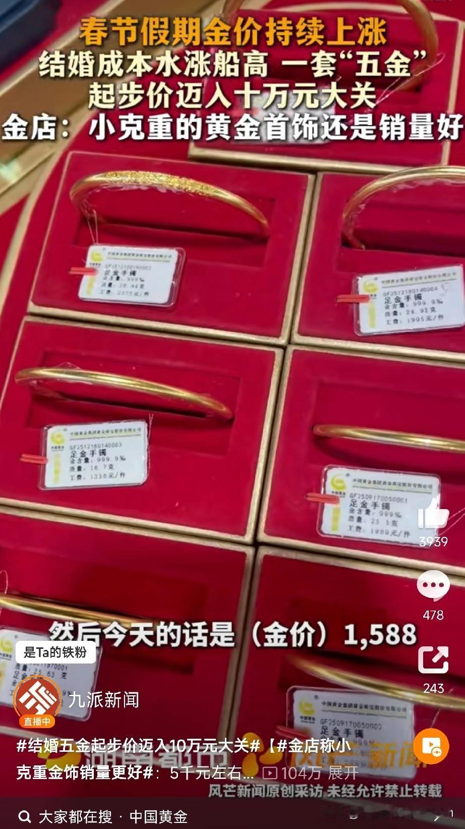 金价疯涨! 结婚五金10万起步? 长沙的准新人们注意了! 中国黄金蔡锷中路店的高店长今天一席话,扎心了——“现在结婚五金,起步价10万打底!” 春节金价涨到1588元/克,一套五金(戒指、项链、手镯、耳环、吊坠)算下来轻松破10万!普通家庭直接懵圈:结个婚,金子比彩礼还“贵”?! 但咱老百姓的智慧是无穷的!金店老板透露:“小克重金饰卖的不错!” 比如6克以内的小套链,价格控制在5000元左右,大家咬咬牙还能接受。年轻人现在都学精了:不追求“大金链子”,反而更爱“小而美”“轻量化”!既体面又不会掏空钱包,还能日常戴,不香吗? “老一辈要面子,我们这代要里子,小克重+金条它不‘双保险’?” 金价再涨,婚礼不能“破产”! 年轻人用行动投票:“拒绝为克重买单,要的是真心和实用!” 高店长也感慨:“现在年轻人更理性,既要仪式感,也要性价比!” 准新人们别慌!结婚是人生大事,但幸福不是用金子称重的!量力而行,选对方式,小克重也能戴出“大排面”! (文章素材来自九派新闻,侵删)