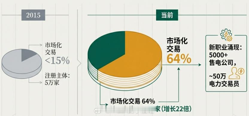 电力市场的十年长征路回头看这十年,变化确实不小!2015年新一轮电改启动时,市场化交易电量还不到全社会用电量的15%,现在已经飙到了64%。电力市场注册主体从5万家爆发式增长到109万家,增长了22倍!光是售电公司就冒出来5000多家,近50万电力交易员这个新职业也应运而生。