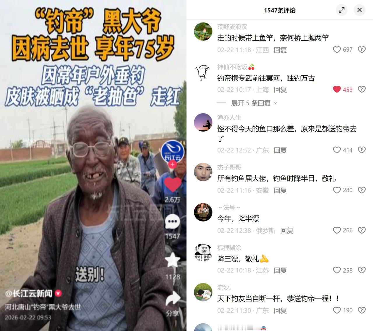 唐山75岁钓帝黑大爷走了 钓龄整整60年,每天雷打不动清晨6:30出门。 野湖一坐就是6小时以上,皮肤晒成正宗老抽色,夜钓时河边一坐都看不清人影。 春节前因感冒送医急转ICU,短短5天就走了,连开春钓鱼的约定都没等到。 现在整个钓鱼圈都在悼念,钓友们喊着降半漂、断杆、冥河钓万古,仪式感拉满。 你说这事儿让人感慨不? 现在咱们活着,张嘴闭嘴都是有用、高效,做什么都得算投入产出,连爱好都得琢磨能不能变现。 可黑大爷呢?60年就守着个钓鱼的爱好,不管不顾,把日子过成了自己最舒服的样子。 这种无用的热爱,恰恰是我们现代人最缺的啊! 多少人这辈子都没为一件事纯粹地疯过、坚持过?黑大爷用一辈子告诉我们,能把喜欢的事做到底,就是最牛的活法! 比起那些追名逐利的成功学,我更羡慕黑大爷这晒得黝黑的无用之美。 愿他在另一个世界,永远有满湖的鱼,永远能安安静静钓一下午。