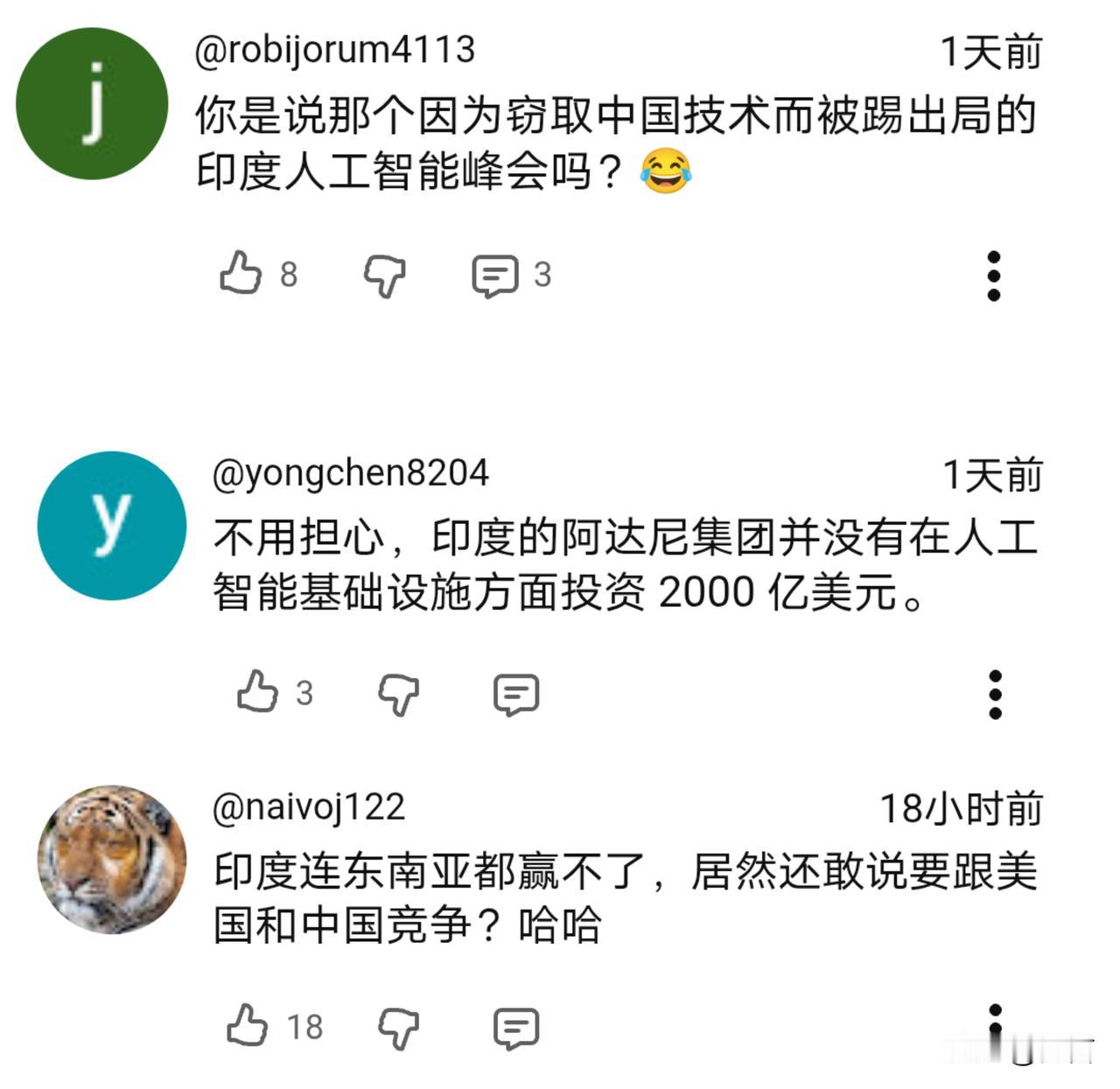印媒:南方国家希望印度在人工智能领域发挥领导作用,同时与中美两国进行竞争。 据印媒2月21日报道,2026德里世界人工智能峰会闭幕,印度承诺投资2100亿美元建设数据中心,并推出新的人工智能大模型,南方国家寄希望印度能够成为领头羊。人工智能领域不止是只有中美两家,还有印度。 另据《今日印度》报道,AIpha Geo创始人兼首席执行官在受访中帕拉格.卡纳表示,他对印度的自主研发能力充满信心,并指出印度庞大的信息量和强劲的经济活力使其能够构建自主的人工智能大模型。印度有能力为世界其他国家提供可行且经济实惠的代替方案。 看得出来,印度不甘于在人工智能领域屈居中美两国之后。那么,其能够如愿以偿吗?国外网友给出了自己的答案…