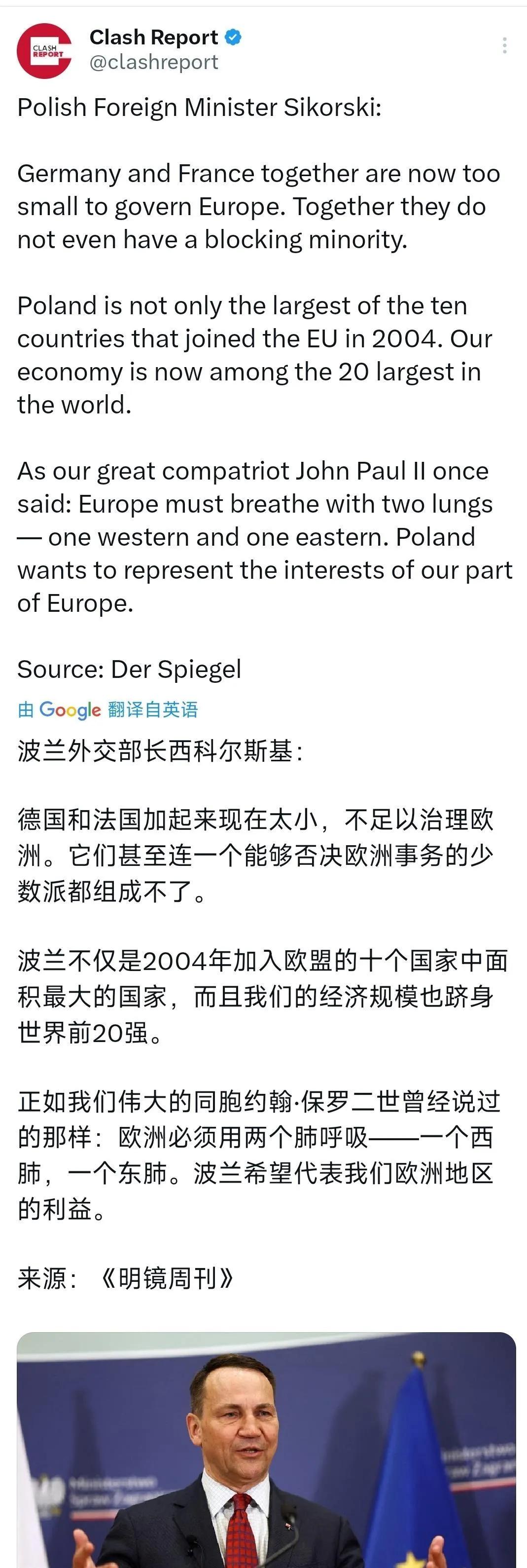 波兰外长西科尔斯基不只是说了图中所列的这些话,还说“波兰坦克数量超过英法德三国的总和,而且这种优势在未来几年还将进一步扩大。”“波兰是为乌克兰的军备、甚至是乌克兰国家本身买单的,因此在任何和平协议中,波兰有权让自己的利益得到考虑。” 点评:波兰这是公开向欧盟伸手要领导权了,要在欧盟与法德平起平坐,变原先的“两只领头羊”为“三驾马车”。 波兰对俄罗斯虽然惧怕,但绝不是怕到骨子里那种,它实际上是通过炒作“俄罗斯威胁论”来显著提升波兰军力,以此增加波兰在欧盟的话语权。 以后的欧盟内部就更加热闹,法国、德国、波兰、意大利都想进一步强化自身的话语权,这反而会加速欧盟变成一盘散沙,更难以统一意志。今后的欧盟,基本无法以一个声音对外说话,而是七嘴八舌。如果乌克兰再加入欧盟,那么欧盟内部又会多一个争夺话语权的。
