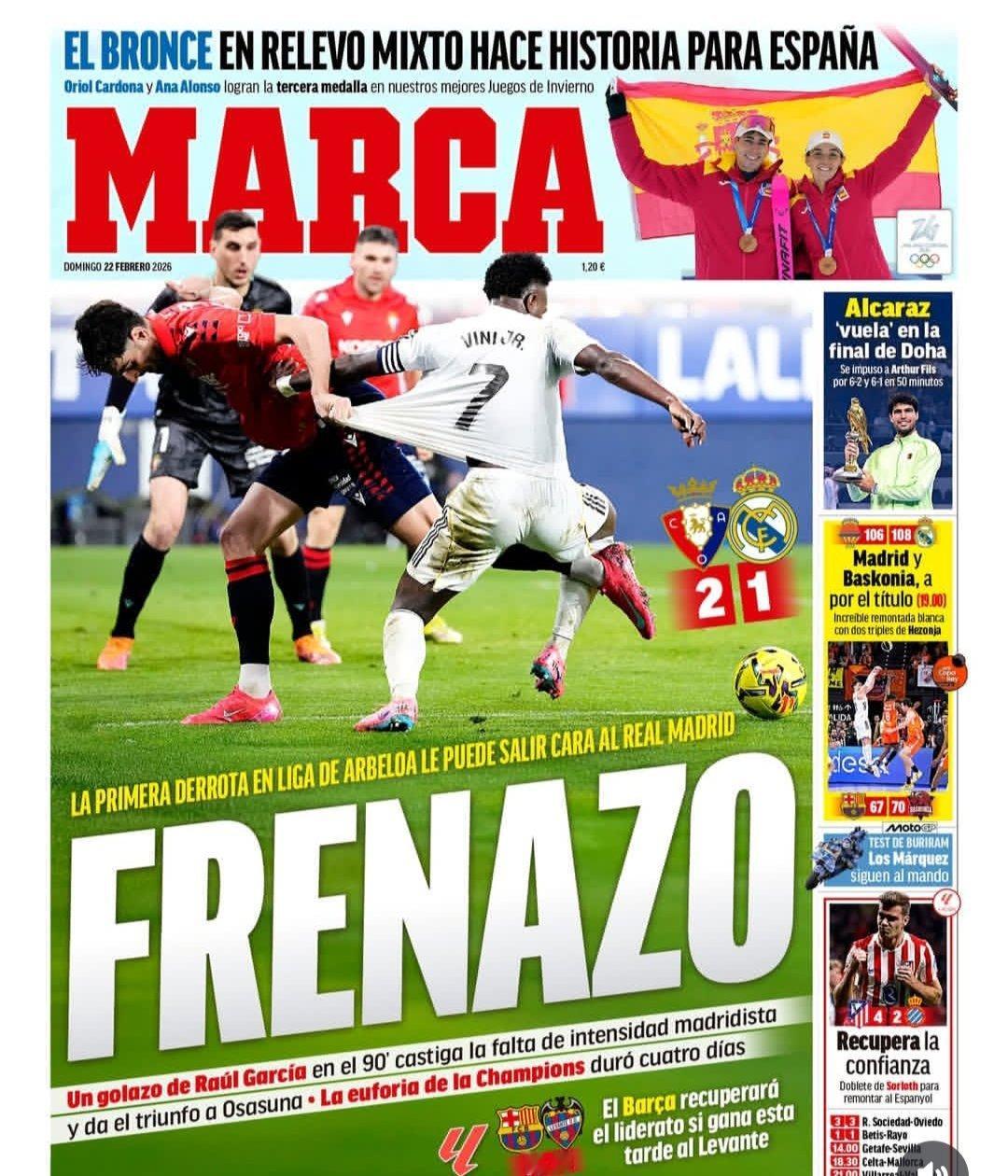 皇马 《马卡》急刹车阿韦罗亚的联赛首败可能给皇马带来影响劳尔·加西亚在90分钟的进球惩罚了皇马的缺乏紧张感并给奥萨苏纳带来了胜利欧冠的愉悦只持续了四天