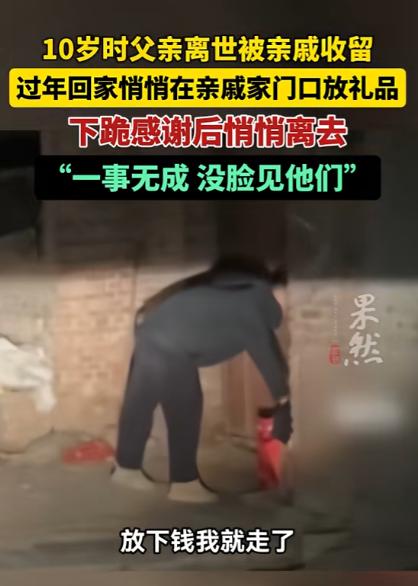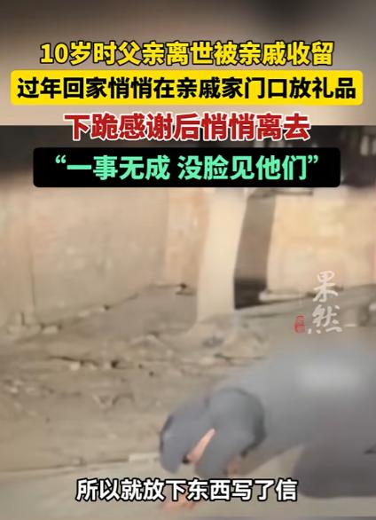 “泪目了!”山东,一男子春节前本想着给几家亲戚拜年,但又觉得自己一事无成,没脸见他们,于是就等到后半夜,趁亲戚们都睡熟了,偷偷买了礼品并写了信,跪下磕头,只因在他幼年无依无靠时,这些亲戚给过他一口饭! 春节期间,家家户户都热热闹闹的,凝聚着团圆的氛围,当时间来到深夜,家家户户的灯都熄了时,一个身形单薄的男人,手里拎着沉甸甸的年货袋子来到了院门口。 他不是小偷,也不是来添麻烦的,他是来还一份藏了二十多年的恩情,只是这份心意,他没勇气在白天送出去。 十岁那年,是他人生里最暗的冬天。 父亲突然走了,原本就不宽裕的家彻底塌了天,空荡荡的屋子挡不住寒风,灶膛里常年冷火秋烟,他瘦得胳膊腿像细柴火,身上的衣服破了洞,冬天冻得手脚长满冻疮,连一顿热乎的饱饭都成了奢望。 那时候的他,怯生生地站在村口,不知道往后的日子该怎么过,是村里的几家亲戚,没说过一句漂亮话,却伸手把他拉进了自家的门。 亲戚们自家日子也过得紧巴,地里的收成刚够糊口,手里的零钱都要掰成两半花,可从来没让他饿过一顿肚子。 那些年,他吃过百家饭,穿过百家衣,听过无数句 “孩子别怕,有我们呢”。他记不清每一顿饭的味道,却记得灶台边的热气。 记不清每一件衣服的样子,却记得棉布裹身的温度,记不清过年时说了多少吉祥话,却记得亲戚们看他时,眼里没有嫌弃,只有心疼和怜惜。 那一口口热饭,一次次收留,不是什么惊天动地的恩情,却是他在走投无路时,唯一能抓住的浮木,让他知道,自己不是没人疼的野孩子。 长大之后,他早早离开家乡,一头扎进外面的世界打拼。他想着好好干活,攒钱,混出个人样,风风光光回村,好好报答当年帮过他的亲戚们。 可成年人的世界从来没有容易二字,工地里搬过砖,餐馆里端过盘,工厂里加过夜班,风吹日晒,起早贪黑。 一年又一年过去,他还是那个普普通通的打工人,没攒下多少积蓄,没买上车房,没做出能拿得出手的成绩,在茫茫人海里,平凡得不起眼。 春节的脚步越来越近,村里家家户户都开始走亲访友,欢声笑语飘满街巷,他也收拾好行李回了家,可站在村口的土路上,他却迈不开腿。 他心里翻来覆去地琢磨,当年亲戚们倾尽全力帮他,是盼着他好好长大,可如今自己一事无成,平平庸庸,没脸去面对那些曾经疼他、帮他的长辈。 他怕看到亲戚们关切的眼神,怕自己的平凡让他们失望,更怕这份藏了多年的感恩,因为自己的落魄,变得拿不出手。 纠结了一天又一天,他终于打定主意,等后半夜,等所有人都睡熟,再悄悄去送这份心意。 深夜的乡村路,坑坑洼洼,他骑着旧电动车,寒气顺着衣领往骨子里钻,手脚冻得发麻,却一点都不觉得冷。 到了第一家亲戚家门口,他把车停在远处,蹑手蹑脚地走到院门前,把礼品稳稳放在门口最显眼的地方,再把信轻轻压在礼品袋上。 做完这些,他缓缓直起身,整理了一下衣角,对着紧闭的院门,恭恭敬敬地跪了下去。 额头轻轻碰到冰冷的地面,一下,两下,三下,这三个头,磕的是当年的一口热饭,磕的是寒冬里的一件旧衣,磕的是二十多年从未忘记的恩情。 他不敢多停留,怕被人发现,怕自己忍不住红了眼眶,磕完头就悄悄起身,拍掉膝盖上的尘土,转身走向下一家。 就这样,一夜之间,他走遍了当年收留过他、帮助过他的所有亲戚家,放礼品,留书信,磕头行礼,全程安安静静,没发出一点声响,没惊动一盏灯,没打扰一个熟睡的人。 天快蒙蒙亮时,他才离开村子,朝着相反的方向走去,身后的村庄渐渐苏醒,而他深夜里的举动,被门口的监控默默记录下来。 真正的感恩,从来不需要功成名就做铺垫,真正的情义,从来都藏在不声不响的行动里。 一口饭之恩,记了半辈子,一份收留之情,用最郑重的礼仪报答,这个山东汉子的心里,装着最纯粹的善良,藏着最厚重的情义,也藏着无数普通人,对恩情最虔诚的敬畏。 对于这件事,您有什么想说的吗?欢迎评论区留言讨论。 信源:齐鲁晚报·果然视频2026-02-19——《10岁父亲离世被亲戚收留,过年回家在亲戚家门口悄悄放下礼品,下跪感谢后离去》