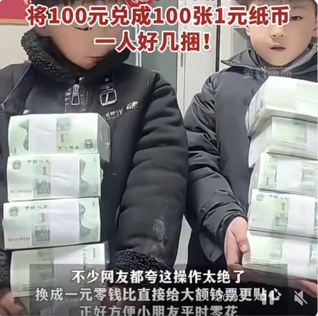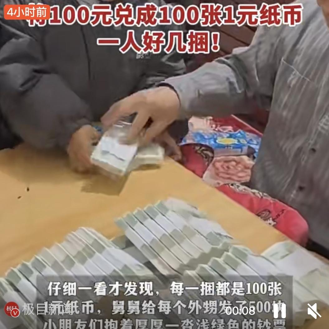 发500元压岁钱,发出了5万的气场。 湖北一位网友分享了舅舅给6个外甥发压岁钱的视频,桌上摆满厚厚一沓钞票。细看才知,每一捆都是100张1元纸币,舅舅给每个外甥发了500元。孩子们抱着厚厚一沓浅绿色的零钱,开心得欢呼雀跃。