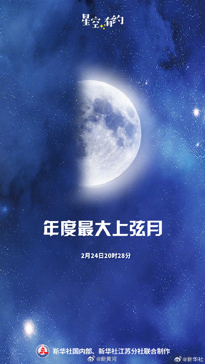 【#2月24日将迎年度最大上弦月#,仅凭肉眼即可欣赏 】2月24日20时28分将迎来今年最大上弦月。届时,月球位于轨道近地点附近,距离地球约37万公里,这轮“半遮面”的上弦月将成为亮眼的天象景观。公众无需借助专业设备,仅凭肉眼即可欣赏。(新华社)