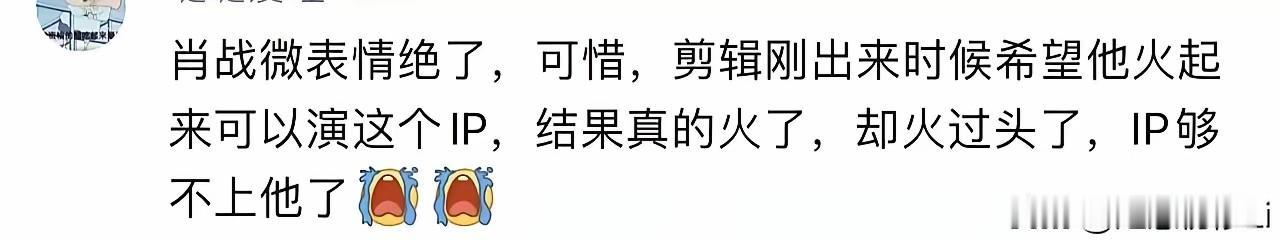 现在炒的各种火热的所谓古偶现偶大IP,很多书粉都希望肖战演自己喜欢的IP男主,但业内都懂,追星的人更懂,这些IP早就够不上肖战的咖位了,魏无羡后,大家就知道了,肖战b站一个拉郎配的剪辑,就可以让多少书粉念念不忘