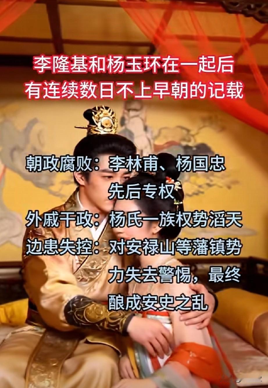 李隆基和杨玉环在一起后 有连续数日不上早朝的记载 前半生开创盛世,他早已倦了朝堂。遇见能懂他音律与心事的杨贵妃,便一头扎进情爱里,把朝政交给奸臣,对隐患视而不见。