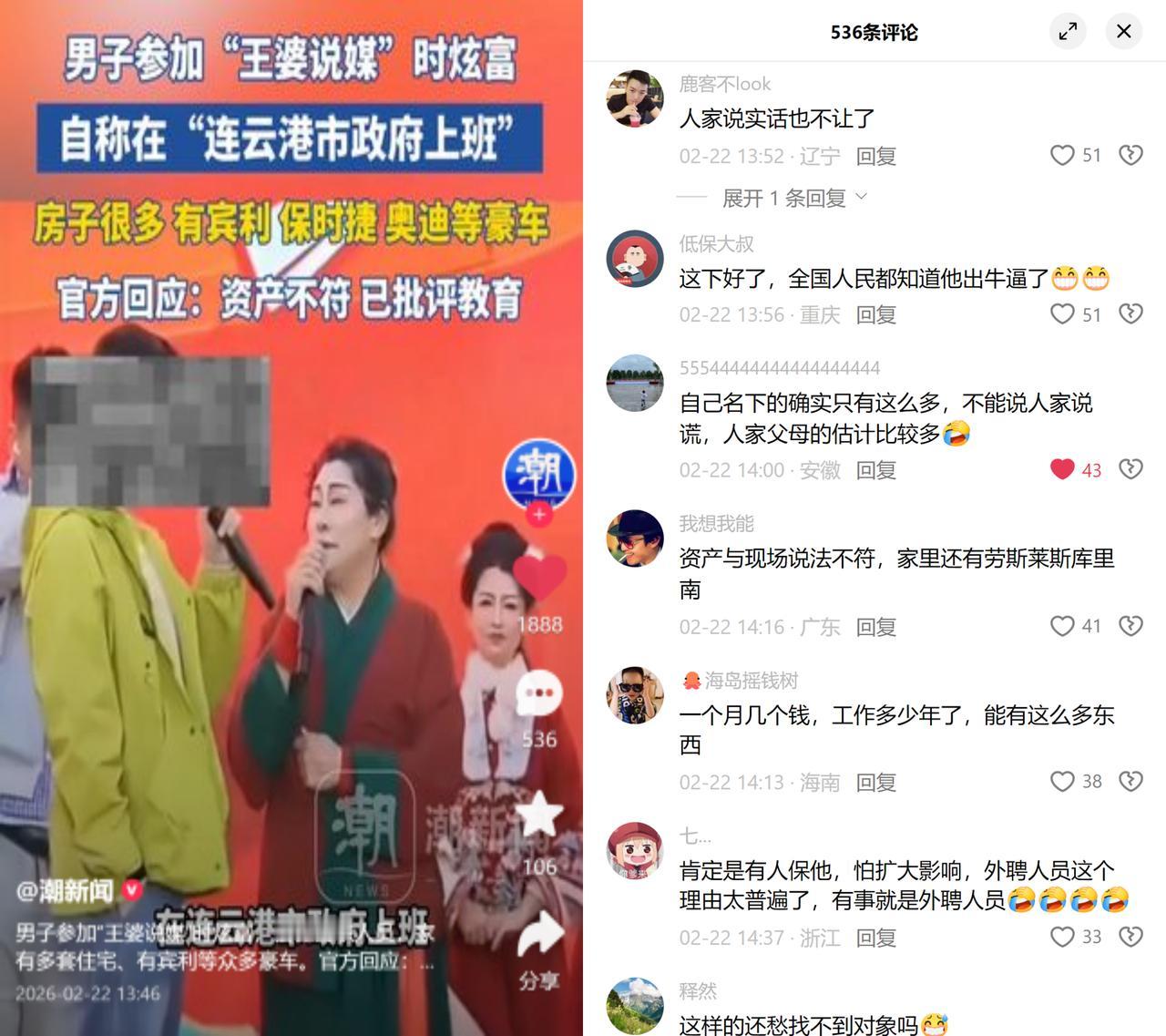 炫奥迪R7的公职男,翻车了! 前几天在王婆说媒舞台上,有个男的自称连云港相关单位工作人员,张嘴就吹有宾利、保时捷,还有不存在的奥迪R7,名下多套房产。 结果官方一查,他是聘用人员,实际只有二手奥迪A7、纳智捷各一辆,两套普通住房,吹的全是瞎话,已被批评教育。 真当大家没开过车?奥迪哪来的R7啊!这谎话编得连基本常识都没有,纯纯把观众当傻子耍。 更耐人寻味的是留言里的反应,没人关心他找不找得到对象,全在怼又是外聘人员。 为啥大家这么反感?还不是外聘这俩字用得太滥了!但凡公职相关出点事,就拿外聘人员当挡箭牌,次数多了,谁还信这一套? 再说了,就算是聘用人员,公众对公职圈的财富本来就敏感。你好好相个亲不行,非要扯公职身份炫富,这不就是往敏感点上踩吗? 有人说他有背景被保了,可连个车钥匙都拿不出来,张口就来的空话,谁信啊? 说白了,这哪是相亲闹剧,是大家对公职身份财富合理性的警惕,更是对外聘免责这套话术的信任彻底崩了!