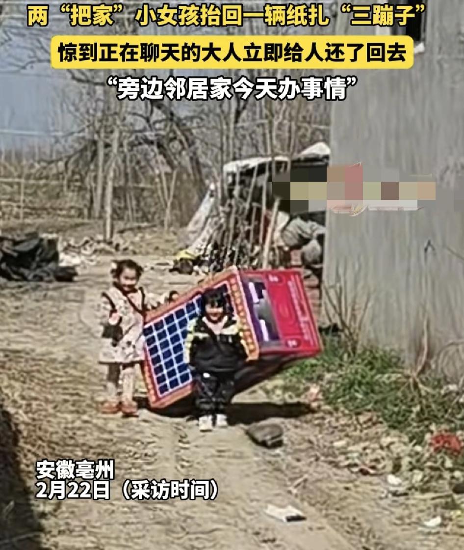 安徽亳州一位网友发视频称,当天邻居家。的老人继续准备办丧事的时候,自己家的孩子到外面玩,突然就捡回来一个纸扎的电动车,家里人看到之后,赶紧就把这一纸品还给别人。当时都挺心慌的。遇到这样的当地风俗,很多地方的人都不让小孩子到外面玩了。