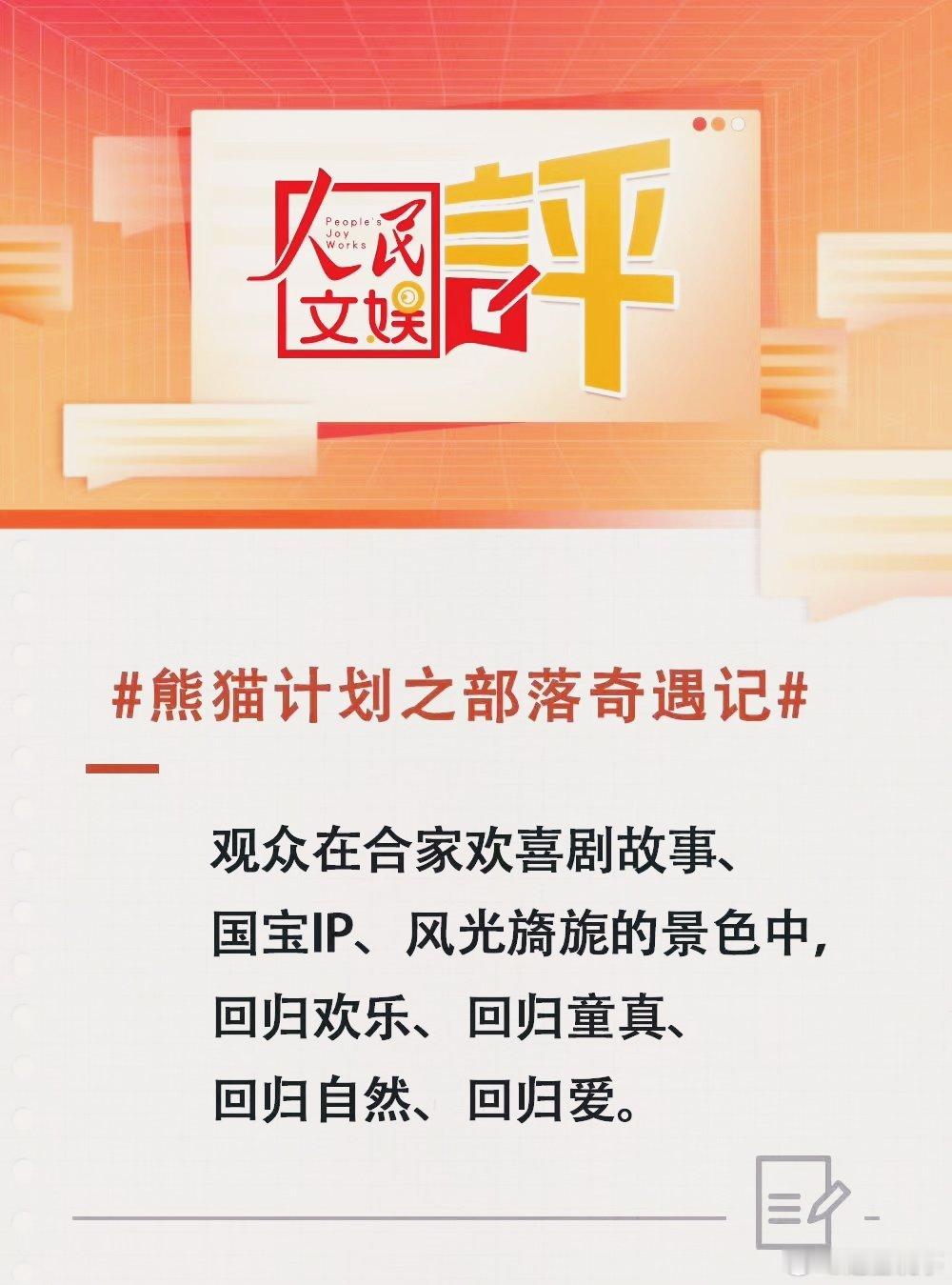 人民文娱评熊猫计划 年度暖心合家欢《熊猫计划之部落奇遇记》,错过真的亏!熊猫胡胡软萌圈粉,部落奇遇欢乐不断,节奏舒服、情感真挚。小朋友看得目不转睛,大人们默默破防,在欢笑与感动里读懂陪伴与成长。春节最适合全家共享的温暖电影,治愈又向上。