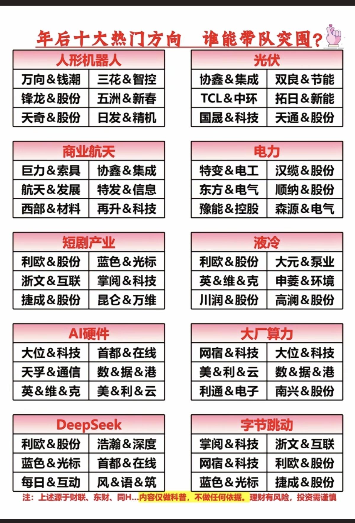 年后十大热门方向,谁能带领突围?! 1.人形机器人 2.短剧+AI应用 3.商业航天 4.Deepseek 5.电力+液冷 6.字节+算力
