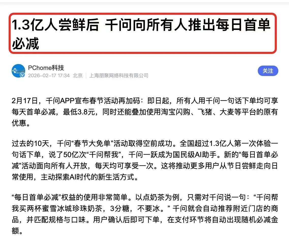 最近看到消息,2月17日的时候阿里千问推出了每日首单必减的活动,最低都能减3.8元。