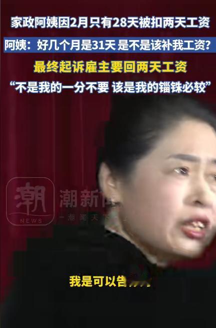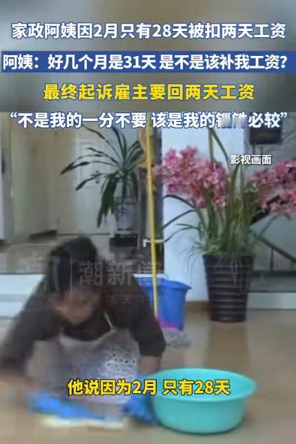 “搬起石头砸自己脚。”2025年5月22日,一家政阿姨因2月只有28天,被雇主扣了400元,阿姨觉得不公平,就反问雇主,还有好几个月是31天,这个钱是不是要补给她,没想到,雇主恼羞成怒,并表示要告阿姨,阿姨一听这话,直接起诉雇主,要回2天工资,网友:不是我的一分不要,该是我的锱铢必较。 2025 年 5 月 22 日,一则家政阿姨维权的小事在网络上快速发酵,没有狗血的冲突,没有激烈的争吵,却靠着最朴素的公平逻辑,戳中了无数普通劳动者的内心。 这位家政阿姨平日里靠着上门做家务维持生计,和多数家政从业者一样,她和雇主约定的是按月结算工资,只要全勤完成当月的家务工作,就能拿到足额的月薪。 她做事踏实仔细,日常负责家里的清洁、整理、日常杂物打理,不管是晴天雨天,还是工作日休息日,只要到了服务时间,都会准时上门,从来没有出现过迟到、早退、缺勤的情况。 和雇主的相处也一直平和顺利,原本以为这份简单的雇佣关系会一直平稳持续下去,却没想到在 2 月的工资结算上,出现了让她难以接受的问题。 2025 年的 2 月是平月,全年里唯独这个月份只有 28 天,比 30 天的小月少两天,比 31 天的大月少三天。 到了发工资的日子,阿姨核对薪资时发现,自己的工资少了 400 元,询问之后才知道,雇主认为 2 月天数少,阿姨的工作时长也相应减少,所以要扣除两天的工资。 这个理由让阿姨觉得既无奈又不公平,她心里清楚,自己整个 2 月都在按时干活,没有少做一项家务,没有偷懒一分钟,天数少是历法的自然规律,不是自己减少了劳动量,凭什么要为此承担薪资损失。 她没有和雇主争吵,也没有做出过激的举动,只是心平气和地和对方沟通,反问了一句直击要害的话:一年里有好几个月份都是 31 天,比常规的月份多一天,那这些多出来的工作时间,你是不是应该把对应的工资补给我? 这句话简单直接,把薪资结算的逻辑摆得明明白白,既然要按实际天数扣钱,那多出来的天数也理应按同样的标准补发。 可雇主并没有接受这个合理的反问,反而因为被反驳而恼羞成怒,不仅不认可阿姨的说法,还认定阿姨是在无理取闹、胡搅蛮缠。 甚至放话出来,声称要起诉阿姨,想用这样的方式让阿姨妥协退让,放弃索要被扣除的工资。 在雇主看来,几百块钱的金额不大,阿姨大概率会为了省事选择忍下来,不会真的为了这点钱走法律程序。 但阿姨的想法恰恰相反,她在乎的从来不是这 400 元钱本身,而是劳动所得应有的公平和尊重。 她靠自己的双手干活赚钱,每一分钱都是辛苦付出换来的,不该被扣的钱,一分都不能少。 听到雇主说要起诉自己,她没有害怕,也没有退缩,反而下定决心,要用合法的途径维护自己的权益。 既然对方想用法律解决问题,那她就主动拿起法律武器,直接向法院提起诉讼,诉求很明确,就是要回被无故扣除的两天工资,不多要一分额外的钱,也绝不放弃属于自己的合法报酬。 提起诉讼之后,阿姨按照流程准备了相关材料,包括双方的雇佣约定、日常工作记录、工资发放记录等,清晰地还原了事情的全貌。 最终,法院给出了公正的判决,支持阿姨的诉讼请求,判定雇主返还扣除的 400 元工资。 这场小小的维权官司,从提起诉讼到拿到结果,没有耗费太多时间,却给了阿姨最踏实的回应,也让原本想施压的雇主,最终落得搬起石头砸自己脚的结果。 阿姨在后续的沟通中提到,自己做家政多年,遇到过很多通情达理的雇主,大家互相尊重,合作愉快,这次的事情让她明白,劳动者不管从事什么行业,都有权利维护自己的合法权益,不用因为职业普通、金额不大就选择妥协。 她也希望自己的经历能给更多人带来启发,遇到不公平的薪资对待时,不要忍气吞声,理性沟通、合法维权,才能守住自己的劳动成果。 在当下的社会里,家政服务、外卖配送、保洁保安等灵活就业岗位,已经成为民生服务中不可或缺的部分,这些岗位的劳动者,用自己的辛勤付出撑起了日常生活的便利。 对于劳动者而言,守住属于自己的每一分劳动报酬,就是守住自己的尊严,对于雇佣方而言,尊重劳动者的付出,遵守公平的结算规则,才是长久相处的基础。 劳动值得被尊重,公平值得被坚守,哪怕只是几百元的薪资,哪怕只是最普通的岗位,合法权益都不该被忽视,更不能被随意侵犯。 对于这件事,您有什么想说的吗?欢迎评论区留言讨论。 信源:潮新闻2025-05-22——《家政阿姨因2月只有28天被扣工资,选择勇敢拿起法律武器保护自己》