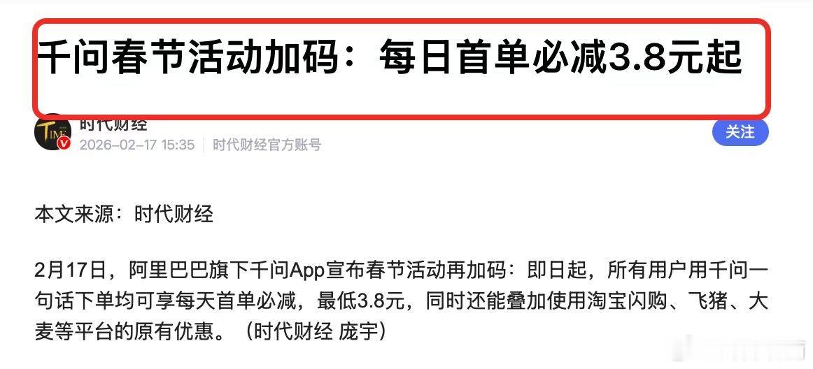 很显然,千问推动为大家办事,并没有停下来的意思。2月17日,千问又推出了每日首单必减的活动,最低都能减少3.8。
