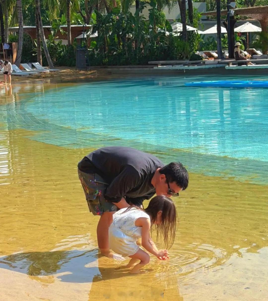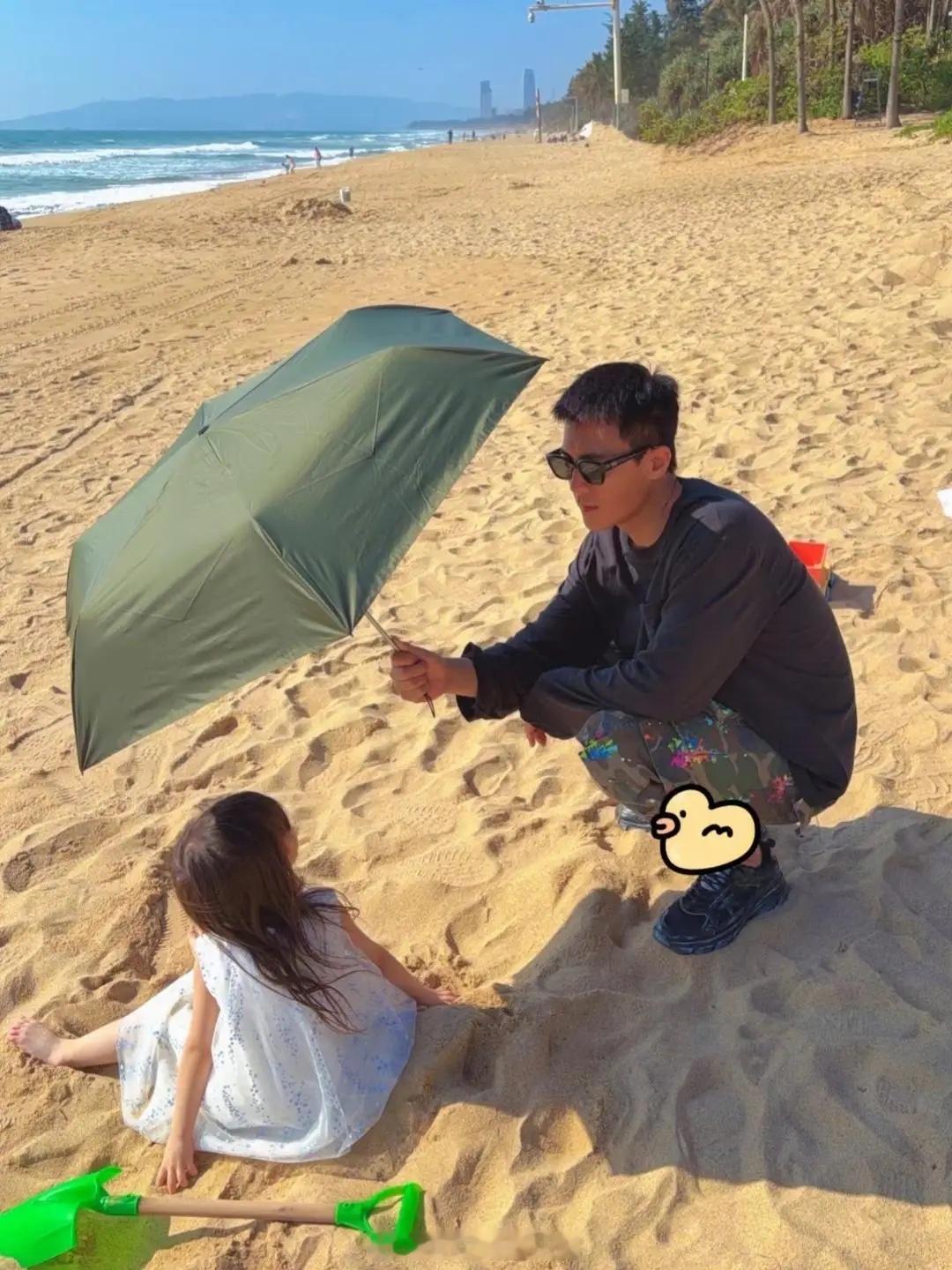 杜淳和老婆女儿现身海南三亚旅游,他带小女儿到海边玩水,他陪着“小蛋饺”在海边玩水,贴心帮女儿撑伞,真的太有爱了!,沙滩上铲沙子,真是个“女儿奴”啊!
