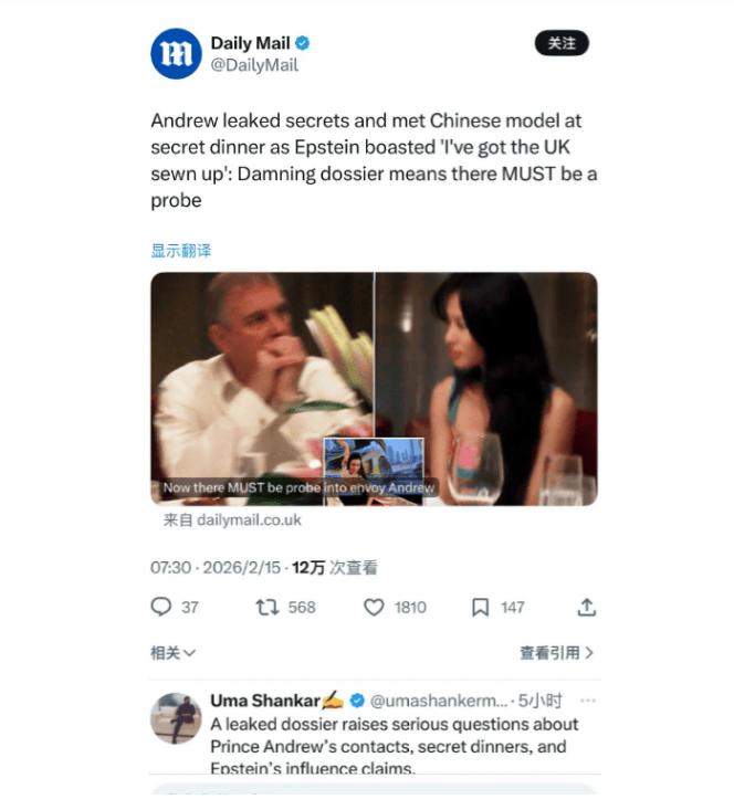 英国王子嘴不严,泄密10+次,从风光特使沦为阶下囚 英国王室又出丑闻了?1名王子、10多次泄密、1场秘密晚宴、2次重罚,这场震惊全球的闹剧,藏着一个扎心反转——国王查尔斯三世的亲弟弟安德鲁,以前风光无限的王室贸易特使,居然和罪犯爱泼斯坦混在一起,还管不住嘴到处泄密,最后把自己送进了警局。 安德鲁王子以前是英国王室的重要成员,顶着贸易特使的头衔,满世界飞,看着特别风光。大家都觉得,他会好好维护王室名声,帮英国拉投资、谈合作。可没人想到,他居然和爱泼斯坦那种罪犯搅在一起,还管不住自己的嘴,啥秘密都敢说,把英国王室的脸丢光了。 英国《每日邮报》2月15日报道,安德鲁王子又泄密了。他说,自己和爱泼斯坦在一场秘密晚宴上,认识了一名中国模特。这场晚宴在2010年9月举办,当时他正以贸易特使的身份访问中国。这趟行程本来是公费,是正经的公务。可他私自把前四天改成私人时间,让助手在一家顶级五星级酒店安排了这场晚宴。这个助手,也是爱泼斯坦的好朋友。 晚宴上的中国模特,当时才23岁,后来改成当演员和瑜伽老师。没有任何证据证明她做过违法的事,也不是爱泼斯坦案的受害者,只是被人安排在安德鲁身边。最离谱的是,安德鲁自己管不住嘴,居然把这件事当成秘密随便说出去,压根没考虑会有什么后果。 这不是他第一次泄密,也不是第一次因为爱泼斯坦出丑闻。爱泼斯坦案的文件显示,他当贸易特使的时候,泄露了很多国家机密和商业机密。2010年,他把阿富汗赫尔曼德省重建项目的绝密简报发给了爱泼斯坦,里面有当地金矿、铀矿的开发信息。那个地方当时还是战场,很多英国士兵在那里牺牲了。这份机密一泄露,很可能破坏英国在当地的安排。 他还把英国财政部关于冰岛金融危机的机密报告,收到才两小时就转发给了富豪朋友。收到越南、香港、深圳的访问报告,不到五分钟就发给了爱泼斯坦。他甚至泄露了苏格兰皇家银行、阿斯顿·马丁的内部机密,把这些该保密的信息,当人情送给别人,根本不管英国的利益。 更让人看不起的是,他还一直撒谎。他说2010年12月后,就和爱泼斯坦断了所有联系。可曝光的邮件显示,2011年2月,他还在私下和爱泼斯坦联系,邮件里写着“我们同舟共济,必须共渡难关”,直接戳破了自己的谎言。 地位和荣誉从来不是放纵的本钱,管不住嘴会惹祸,背叛责任的人,最后都会被自己的贪婪和愚蠢害了自己。 这些丑闻让英国王室的名声受到很大损害,民众对王室的信任越来越低。2025年10月,查尔斯三世剥夺了他所有的尊号、头衔,让他搬出王室住所。他再也不能用“殿下”的称号,只能用平民的名字“安德鲁·蒙巴顿-温莎”示人。2026年2月19日,他被英国警方逮捕,要接受刑事调查。要是泄密和滥用职权的罪名成立,他可能还要坐牢。白金汉宫也说,会全力配合警方调查,和安德鲁王子彻底划清界限。 安德鲁本来拥有别人一辈子都得不到的一切,可他不知道珍惜,非要和罪犯混在一起,最后从风光的王子,变成了人人骂的对象。这和我们生活中一样,不管有多少光环,一旦放纵自己、背叛责任,最后都会一无所有。