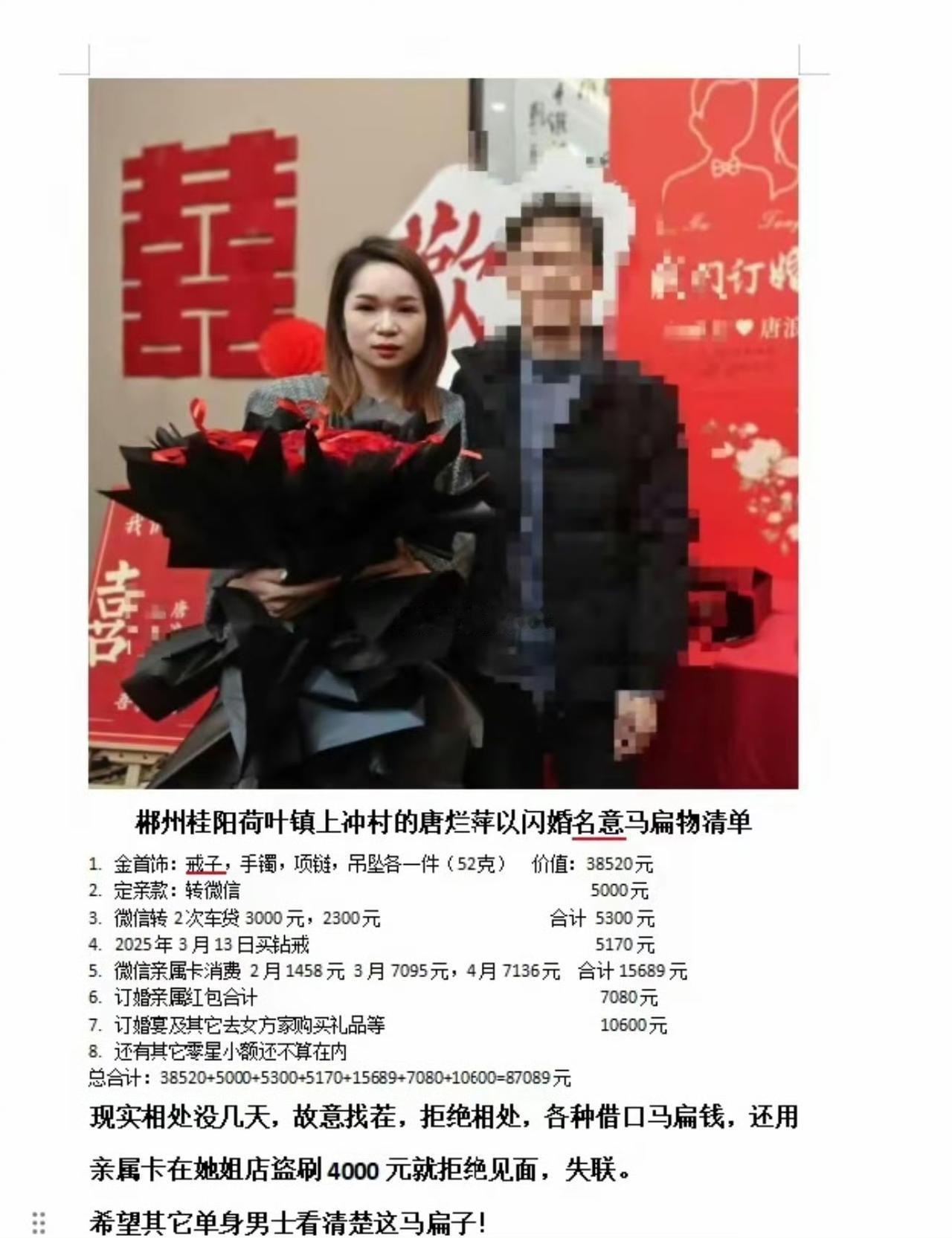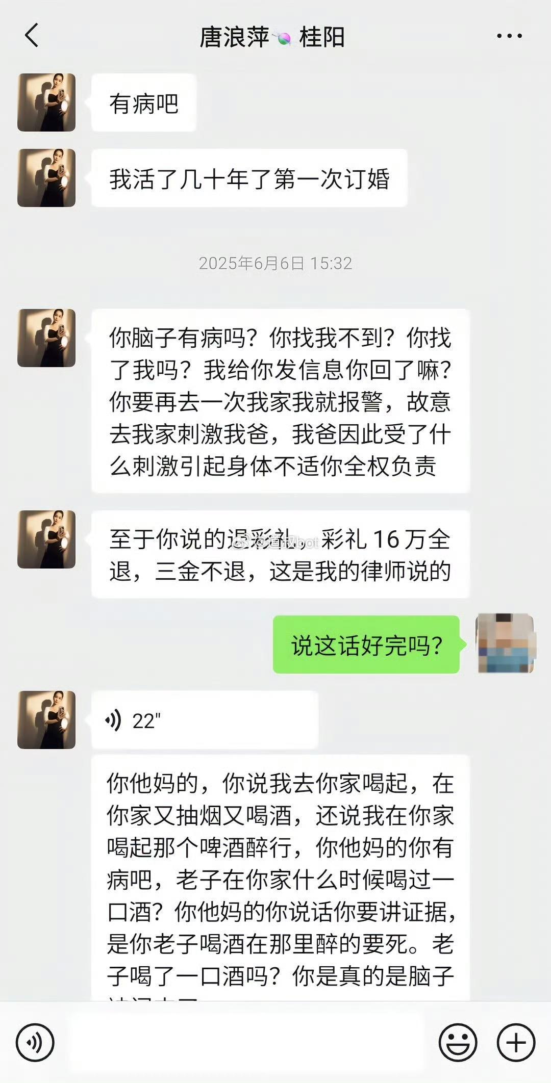 湖南郴州网友爆料遭遇婚骗,彩礼、黄金、钻戒都给了,结果女方玩消失,男方说女滴拒绝交往。从两人的微信对话看,女方素质堪忧,满嘴污言秽语。退婚过程,女方只同意退彩礼,首饰不退,说是咨询了律师。能玩这一手的,明显不是善茬,或者说有备而来。当然,男方这边到底什么问题,会导致退婚,里面没说。婚姻骗婚 彩礼陷阱