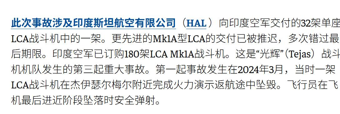 印度光辉战机在本月再次坠毁一架! 截止到2026年2月份,印度总共交付的32架光辉战机,2024年3月坠毁1架光辉战机,2025年11月坠毁1架光辉战机,2026年2月又坠毁1架光辉战机,总体坠毁3架光辉战机。 其实不管是光辉战机,还是印度其他种类的战机,坠毁率都挺高的。尤其是印度装备的米格21战机,曾被誉为是“寡妇制造机”,就是说米格21战机在印度坠毁率,乃是全世界之最。好在印度已经全部退役了米格21战机,要不然还不知道有多少米格21战机坠毁。 目前光辉战机的产能,一直上不去,主要是发动机供应不上。印度购买的美国的F104发动机,每年要供应12台,但实际上连一半数量都达不到。美国对光辉战机发动机的供应是严重不足的,导致光辉战机量产上不去。 反正情况就是这样,光辉战机一共32架,坠毁了3架,坠毁率已经达到了10%。反正可靠性不是多强。尤其是2025年11月份,在迪拜航展上的光辉战机坠毁,让全世界看了一个现场直播,对光辉战机名声的打击非常大。从此以后,光辉战机想要外销,几乎已经不可能了。 再说印度也没有能力外销光辉战机,因为印度自己用的光辉战机都供应不上,别说外销了,再有十年也达不到印度所需要的数量。一味地嘲讽和抱怨,已经没有用了。印度也不会从根上去找问题所在,反正印度都是上下糊弄,凑合过吧。