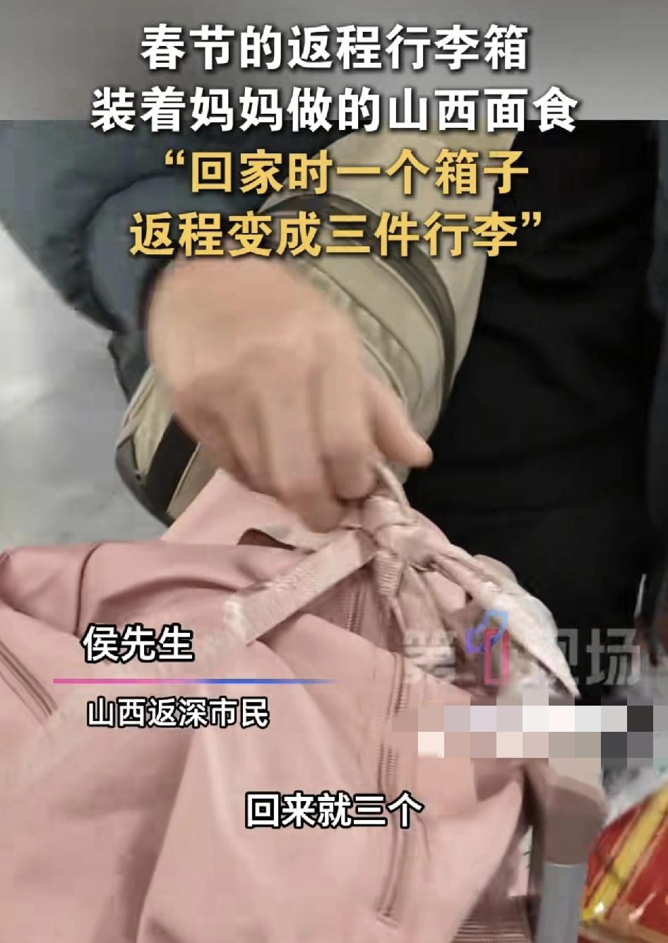 深圳北站一位从山西太原过来的旅客手提着大几件行李,表示自己回老家时只带一个行李箱,返程的时候就变成了三件行李,里面装的都是妈妈带过来的特产,有油饼。馍饼,都是妈妈亲手做给自己带过来的美食,新年的愿望是希望自己多赚一点钱,身体健康就满足了。每一位车站的旅客都承载着他们从故乡带过来的人生故事。在新的一年里,他们将在这片土地上继续前进实现自己的梦想。