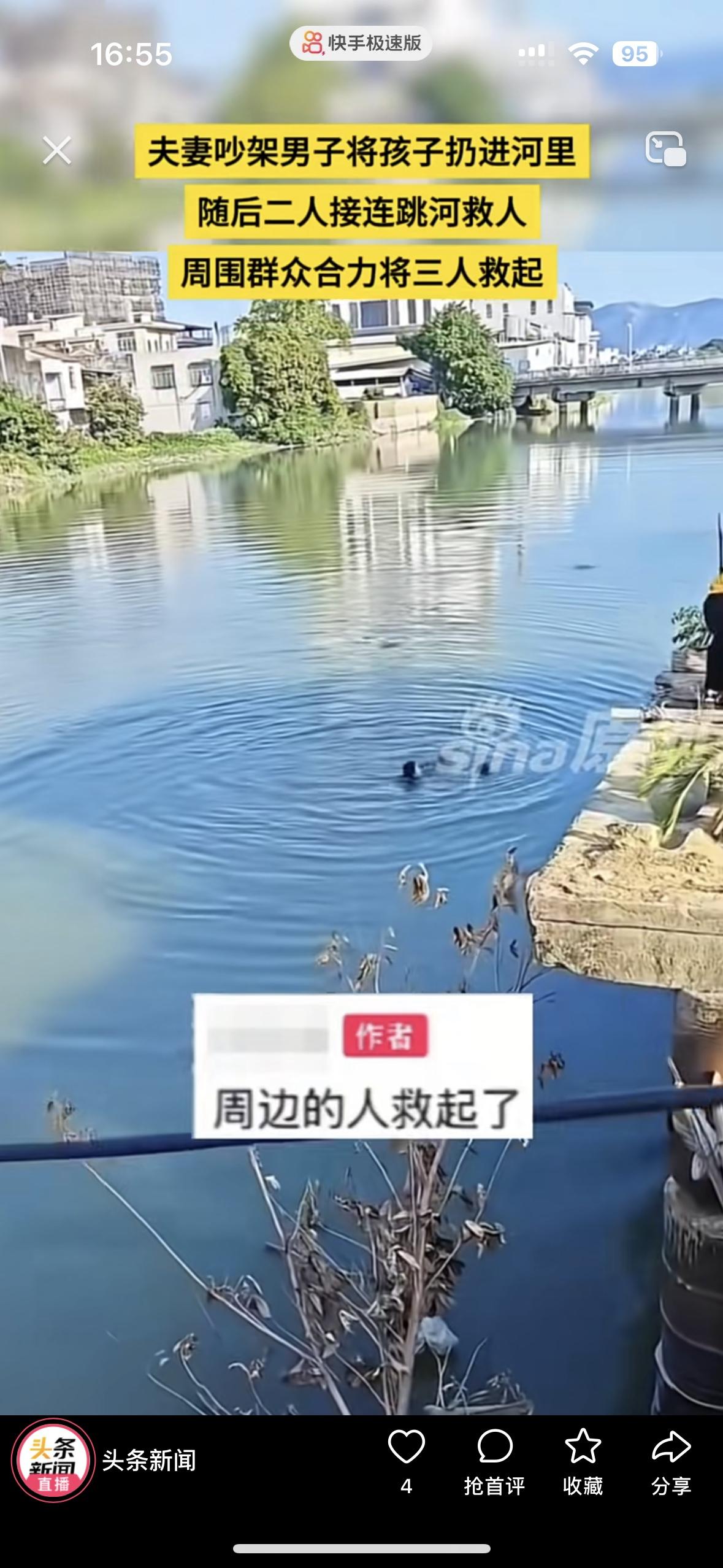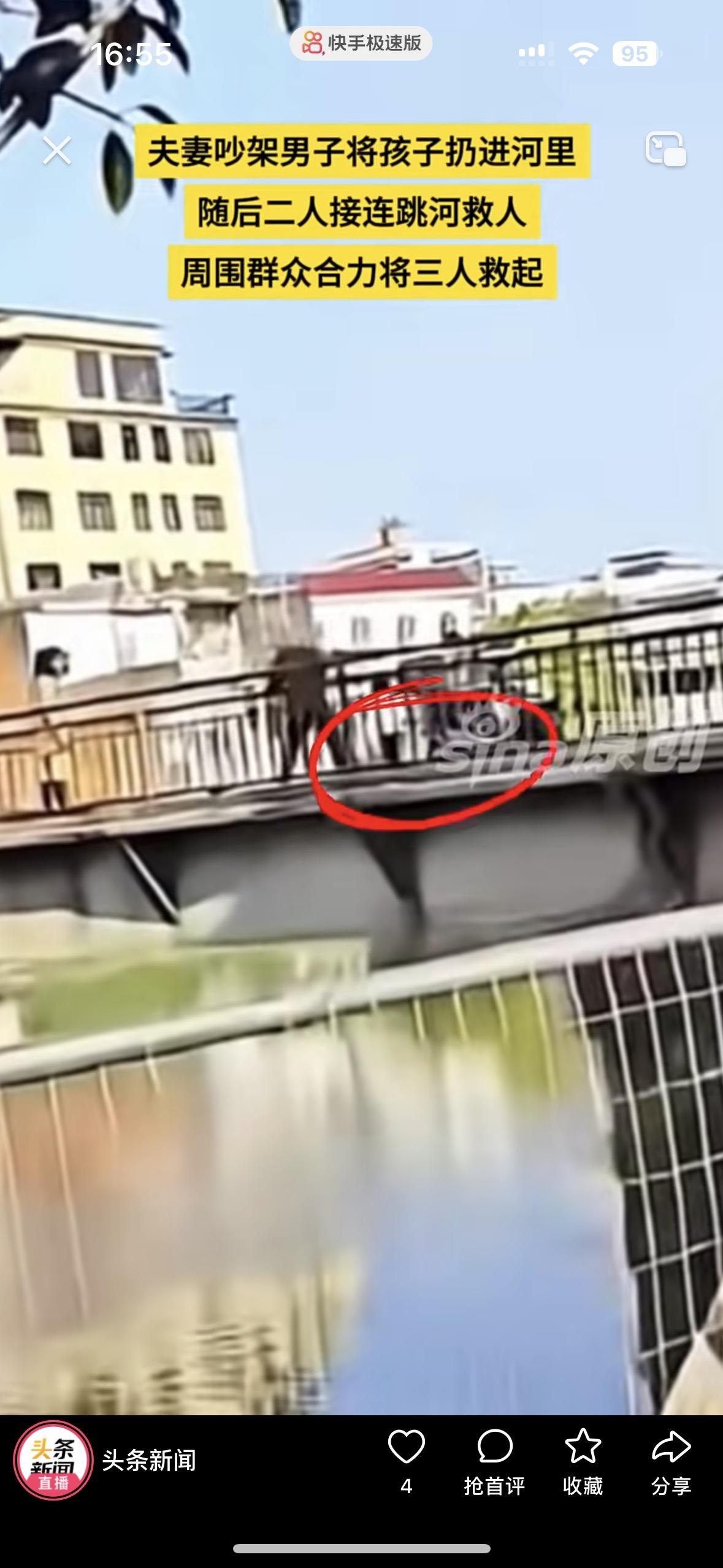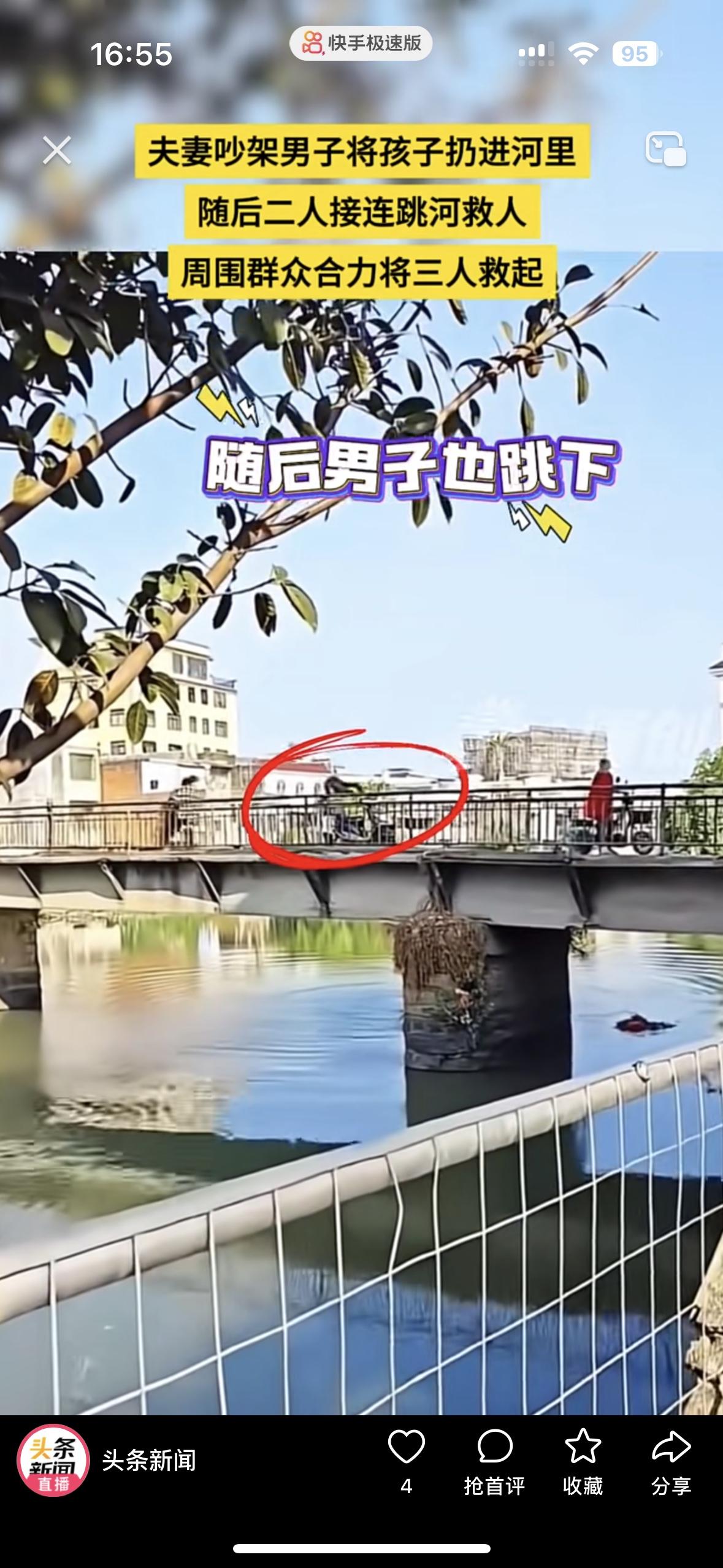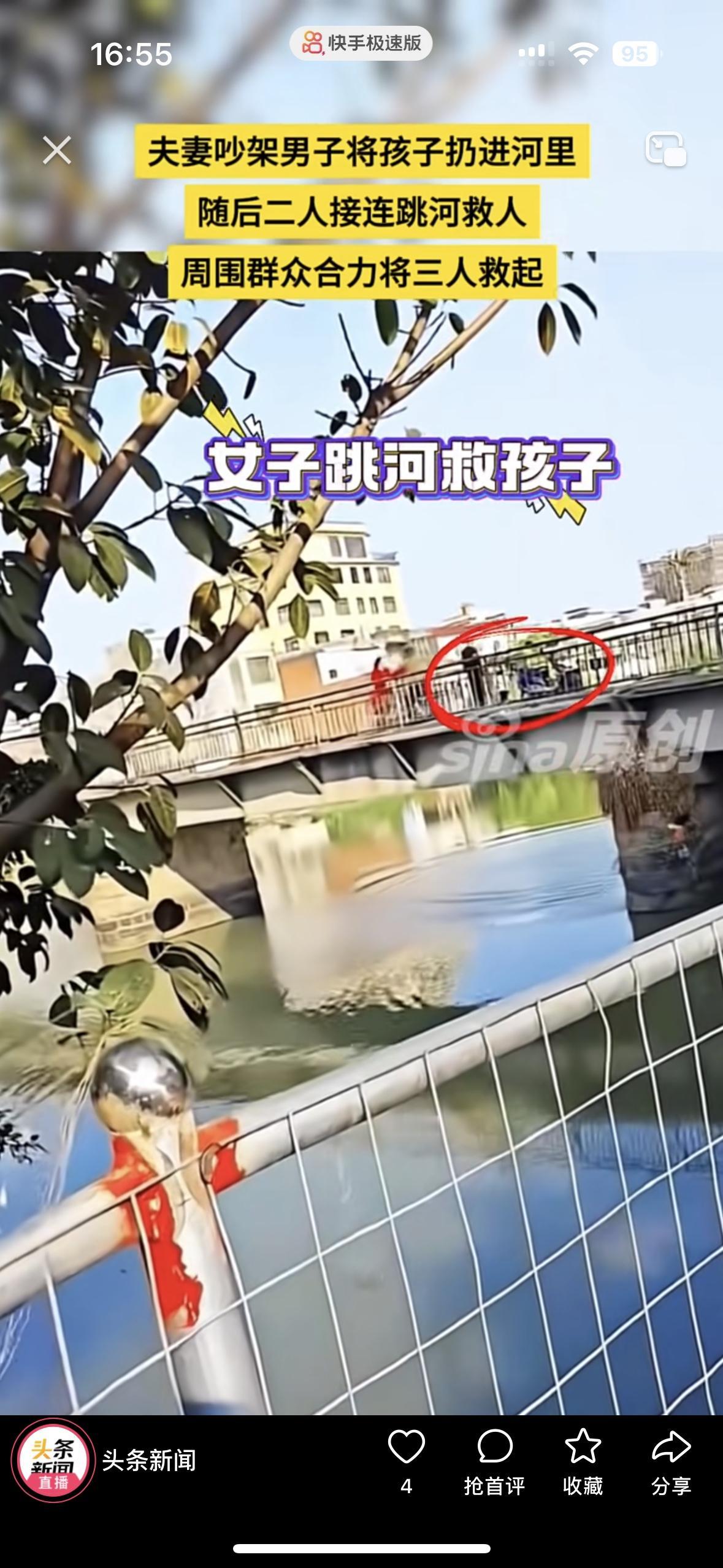 一对夫妻在桥上吵架谁也不服谁,吵到最后男的把孩子从桥上扔到了水里去。 孩子落水后,妈妈瞬间破防了,没有丝毫犹豫就跳下去救孩子,男的也瞬间清醒了,也连忙跳下去救他们。 幸亏路人看到了,把他们一家三口救了上来。真替孩子揪心,摊上这样的父母,吵架拿着孩子撒气,怎么配为人父母呢?