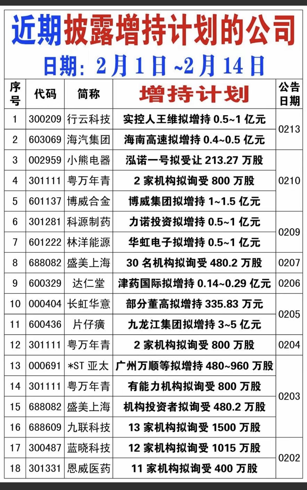 2.22周日 近期披露 增持计划的公司! 18家公司披露增持计划。能在这个点位增持的,绝对都是良心好公司,可以跟踪观察。 18家拟增持公司名单:
