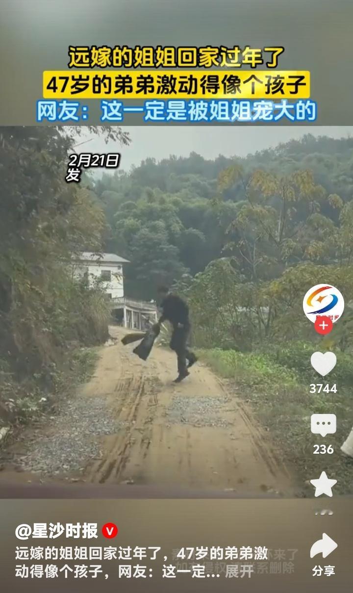 远嫁千里姐姐突现家门,47岁弟弟秒变手舞足蹈孩童!这一幕让全网泪奔:原来每个中年男人心里都住着个等姐姐回家的少年 (来源:星沙时报及综合自网络平台热议内容) 视频里那个蹦跳欢呼的男人,已经47岁了。可当远嫁多年的姐姐推开家门那一刻,他瞬间丢掉了所有成年人的稳重,像个孩子般手足无措地笑着,眼眶通红。许多网友说:“一看就是被姐姐宠大的弟弟。”原来,无论年纪多大,在姐姐面前,我们永远都是那个需要被照顾的少年。 这份手足之情,早已刻进了骨子里。小时候,姐姐是挡在前面的保护伞,是把糖果偷偷塞进你口袋的守护神。长大后,她成了远方的牵挂,电话里的问候总带着千里之外的温度。那些说不出口的思念,都在重逢这一刻化成了最笨拙却最真实的欢喜。 为什么这一幕能瞬间击穿千万人的心?因为我们都在这个47岁弟弟身上,看到了自己。平日里的父亲、丈夫、职场人,那些必须紧绷的角色,在至亲面前轰然卸下。原来每个中年人的心里,都藏着一个渴望被疼爱的小孩。 远嫁的姐姐,是父母心头的朱砂痣,又何尝不是弟弟记忆里的白月光?她带走了年少时热闹的朝夕,留下了绵长岁月里淡淡的惆怅。每一次重逢,都像是时光特意安排的馈赠,让我们重温那段被无条件宠爱的年华。 在这个独生子女居多的时代,这种手足深情显得尤为珍贵。那是共享过同一碗饭、睡过同一张床的亲密,是流淌在血液里的默契。即便多年未见,一个眼神就能回到从前。这种感情,比爱情更坚韧,比友情更深厚。 我们被感动,是因为在浮躁的社会里,这份纯粹的情感太难得。没有算计,没有权衡,只有最本能的欢喜。弟弟的“失态”,恰恰证明了有些感情从未被时间磨灭——它只是静静沉淀,在重逢时迸发出最耀眼的光芒。 常听人说“长姐如母”,其实姐姐还是通往童年的任意门。在她面前,我们可以暂时不做成熟的大人,可以做回那个会撒娇、会任性的自己。这份特权,是血缘赐予我们最温柔的礼物。 愿所有远行的姐姐,都能被世界温柔相待;愿所有等待的弟弟,都能常拥这份手足情深。人间最暖,不过久别重逢时,有人为你变回孩子模样。 亲情无价 手足情深