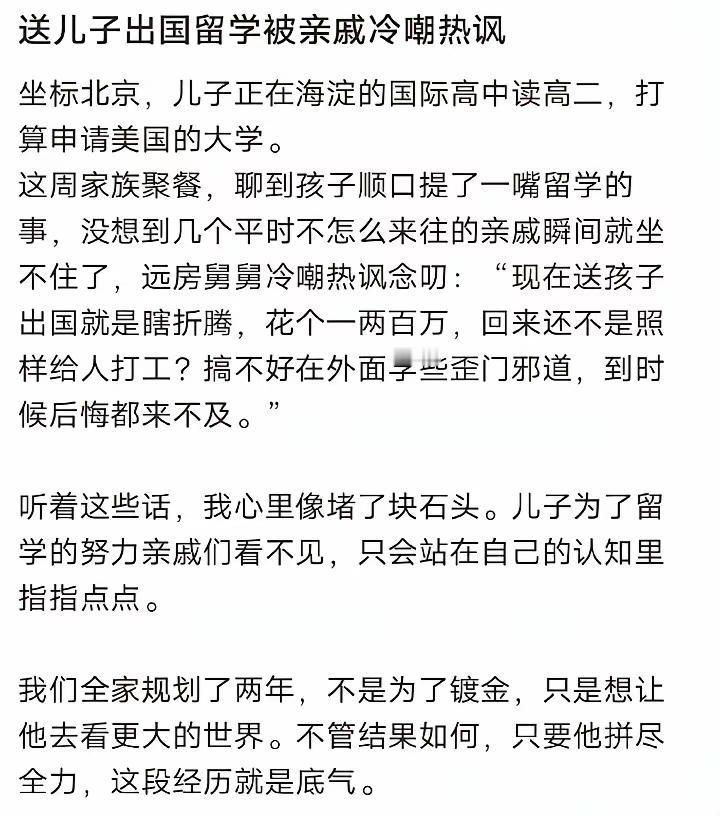 既然想的那么清楚, 那还在意亲戚的冷嘲热讽干什么? 也许,让她难受的不是应不应该留学, 而是本以为在亲戚面前露脸的事儿, 没有得到预期的效果, 反而被人讥讽, 一下子受到精神打击了。 她想不通的是, 以前别人送孩子出国总会引来羡慕, 为啥轮到自己就成这样了呢?