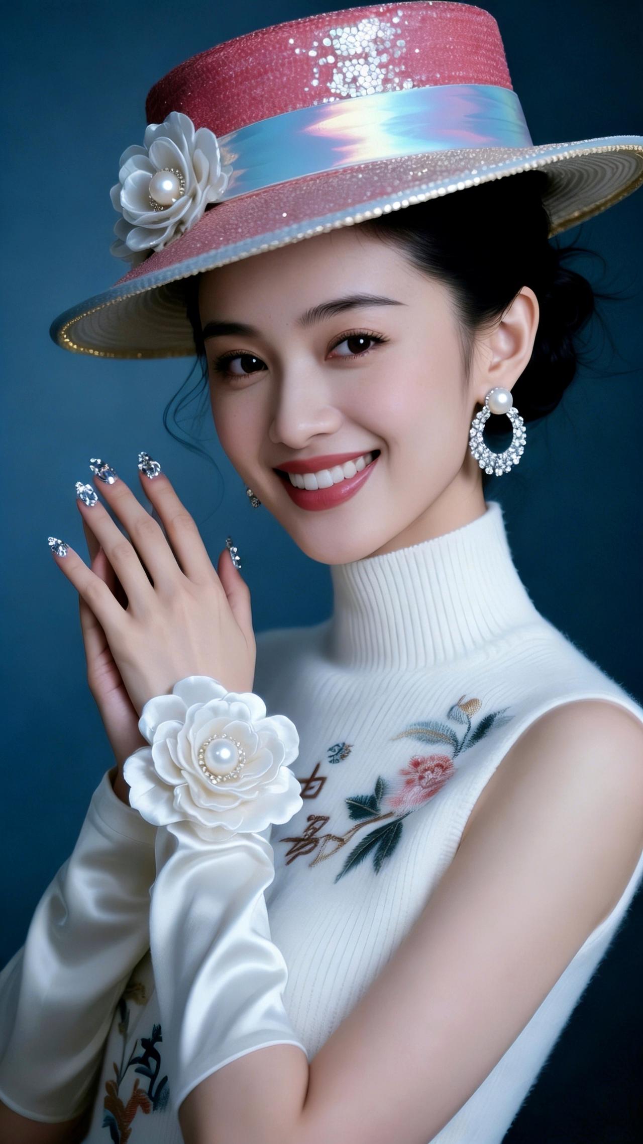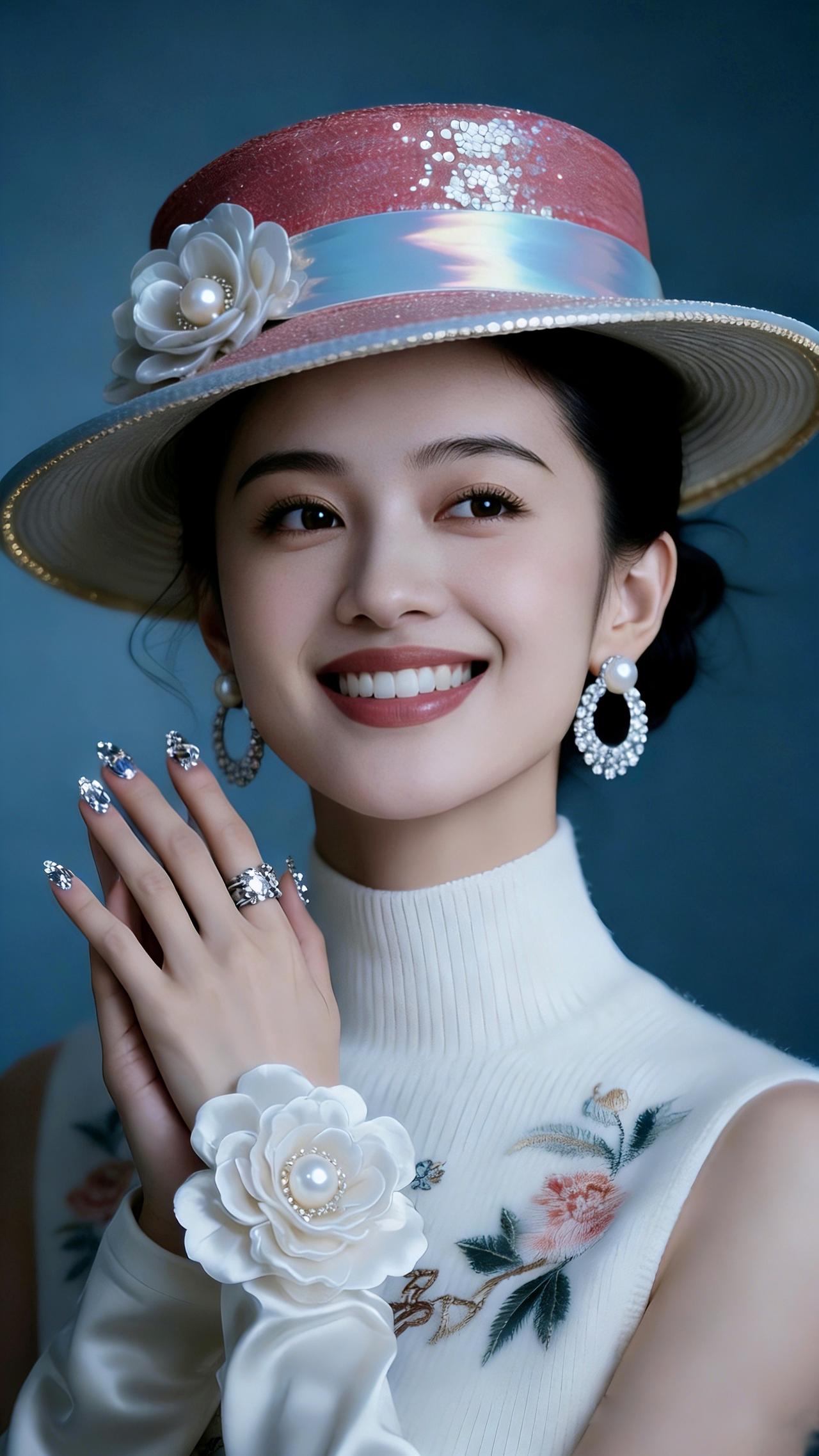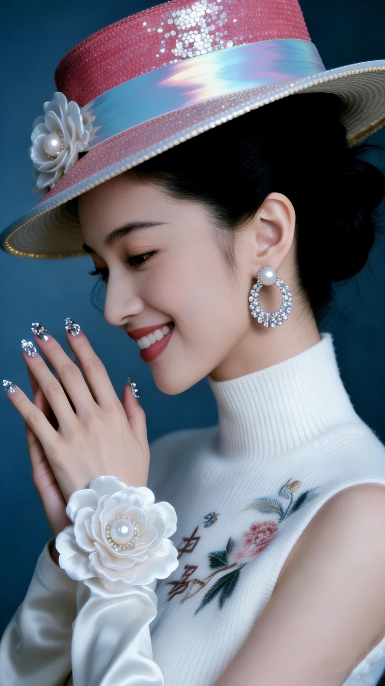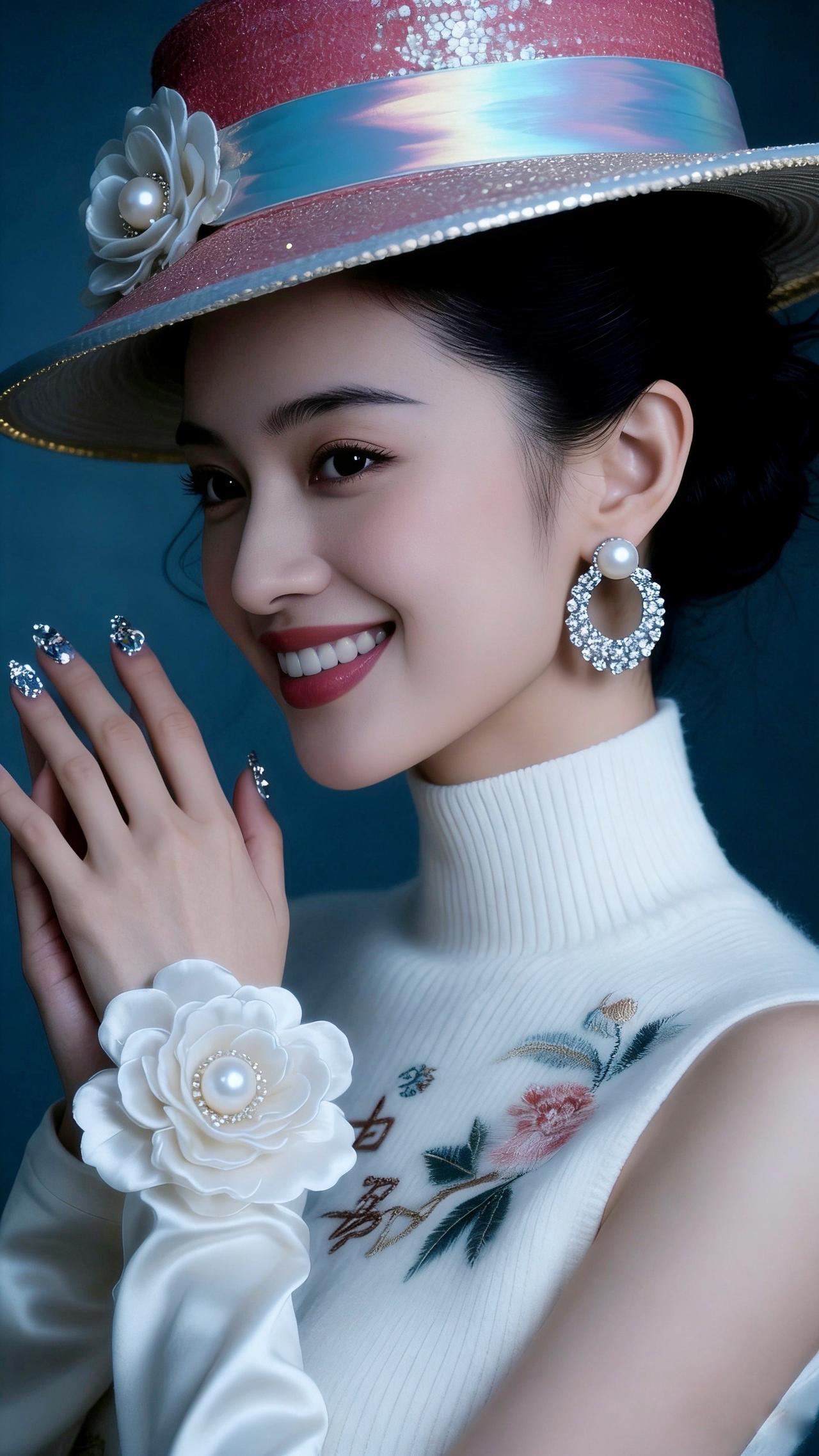 九帧同绘粉帽雅仙。粉帽缀白花珍珠亮片,白衫绣卉显雅姿,珍珠圆环耳腕饰添华。眉眼含笑温婉醉,深蓝衬复古仙韵,指尖钻饰耀柔光。如画中佳人踏春来,一眼沦陷! 图片为Al辅助完成,请注意甄别! 你最喜欢的手机壁纸什么样