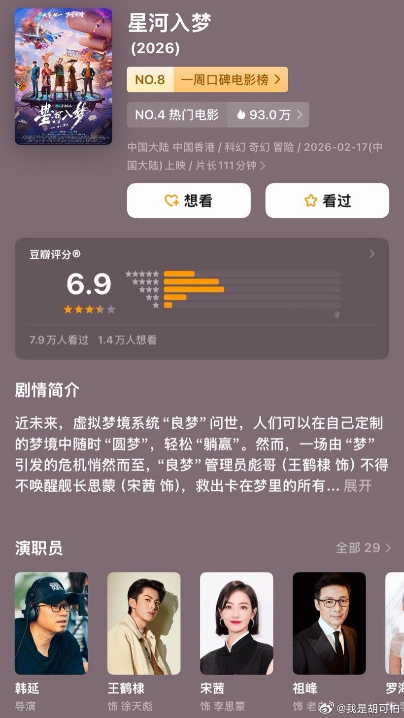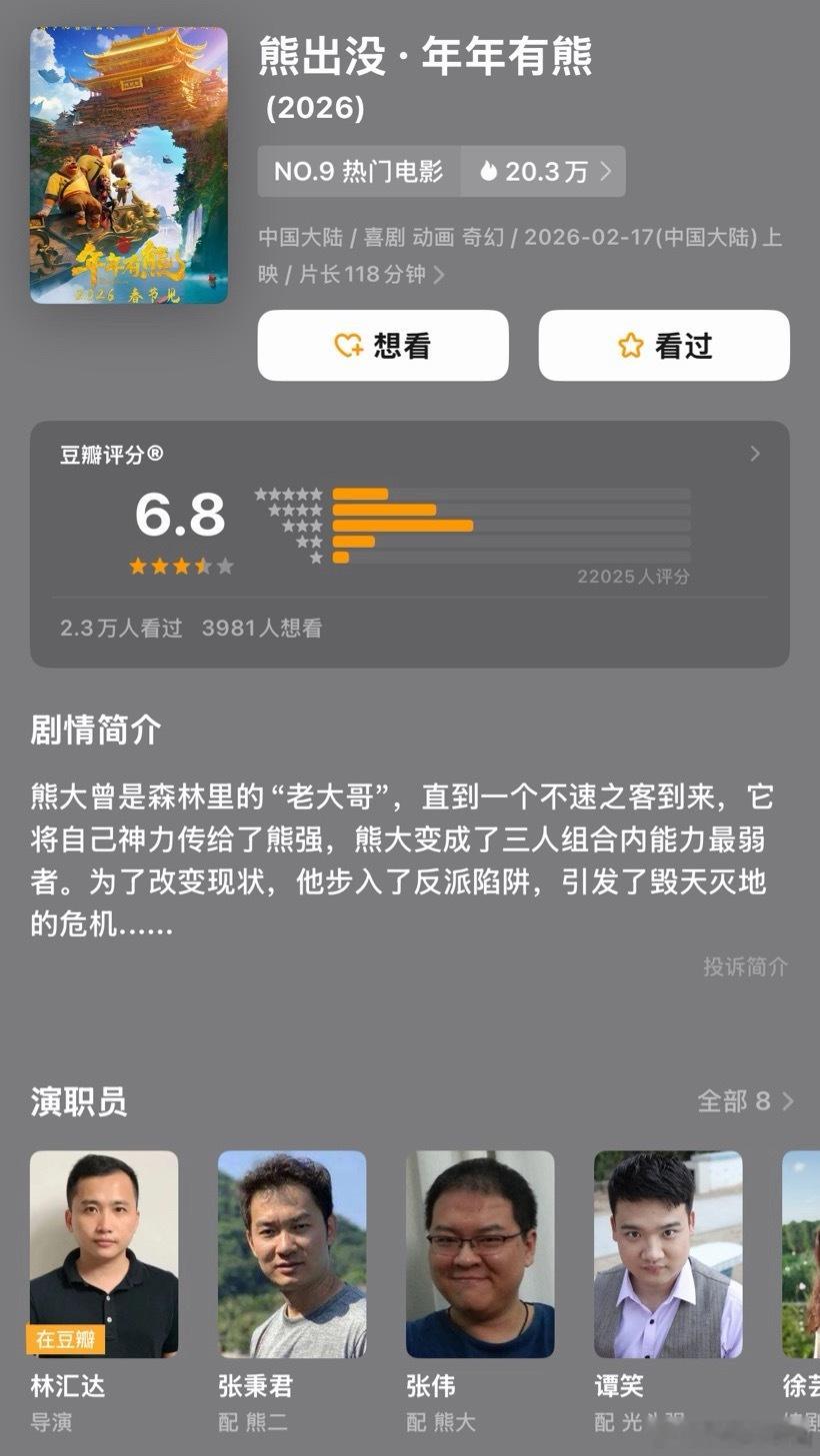 《星河入梦》《惊蛰无声》小幅下调,《熊出没·年年有熊》开分6.8,《熊猫计划2》暂未开分。