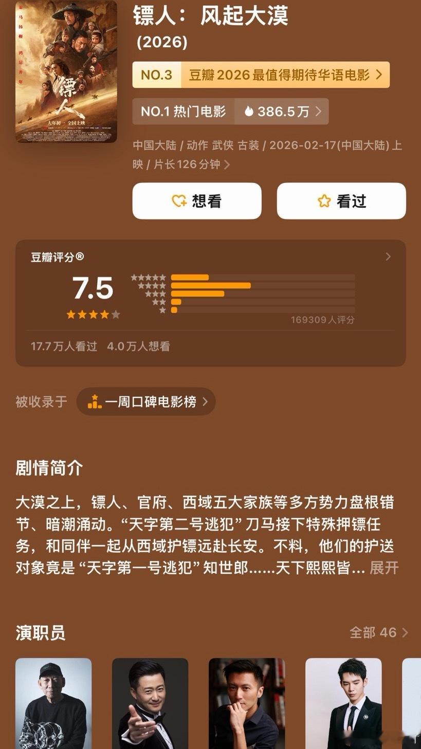 《镖人:风起大漠》口碑升至第一,7.5分稳居榜首,更成为春节档唯一连续3天单日票房逆跌影片。