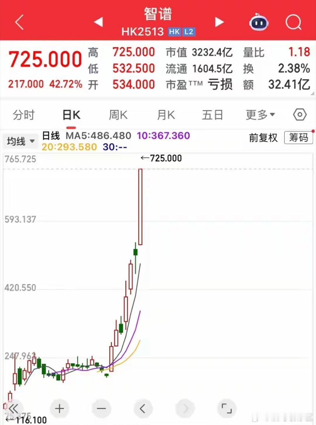 AI应用起飞!智普大涨625%市值3200亿,然而公司营收却不足2亿!这只股票才是炒预期炒未来的典范,上市一个月股票从发行价的116.20上涨到了上一个交易日的725,涨幅625%,一个月涨了6倍多,公司市值也从不足500亿翻倍到了3320多亿,也许投资者想到了上涨,但没想到会涨这么多。