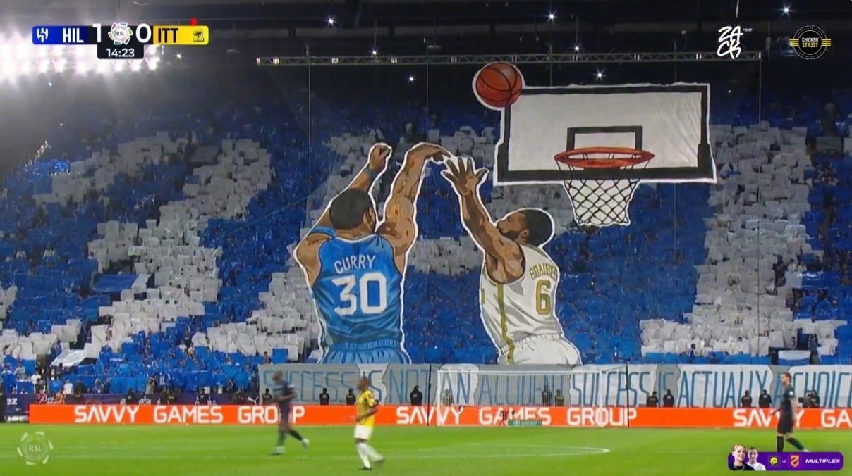 破圈!在今日沙特国家德比赛中,利雅得新月主队拉起巨型TIFO致敬库里,象征着在对手球队头上轻松拿到3分。