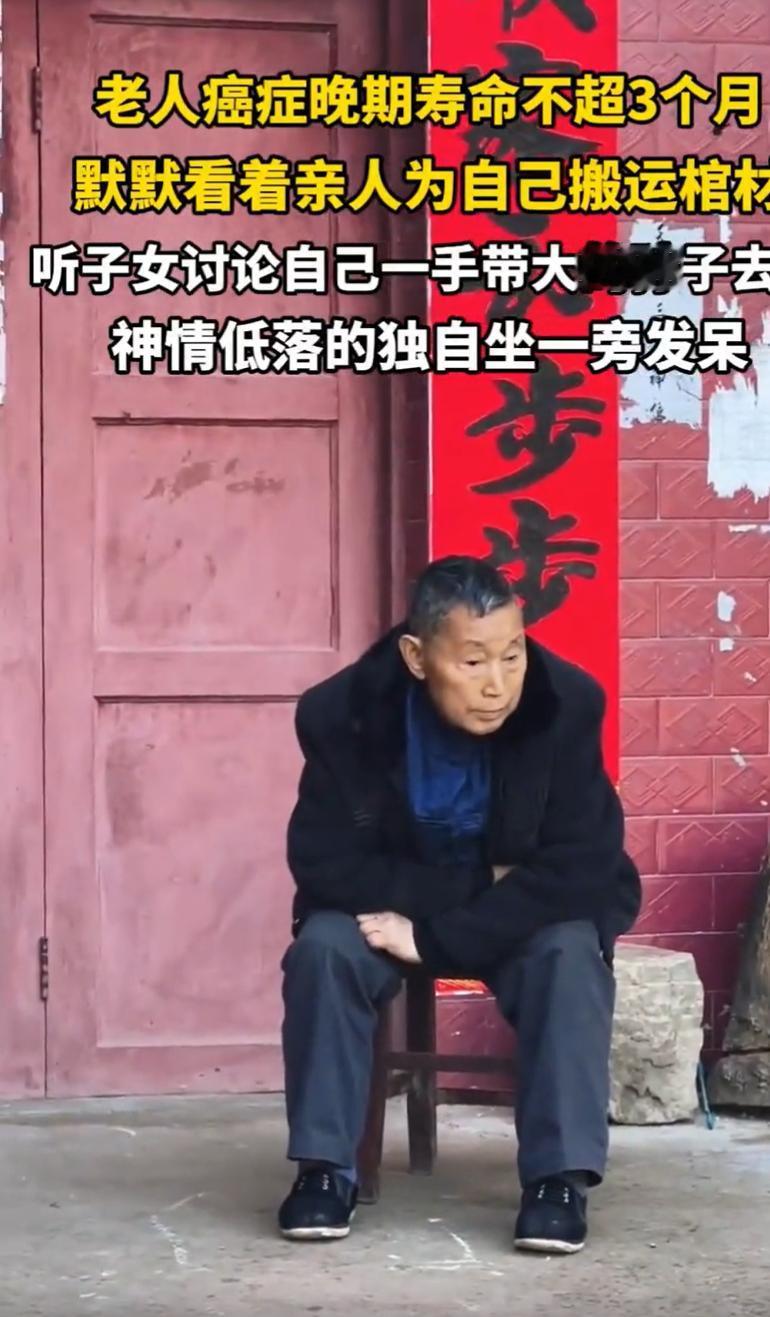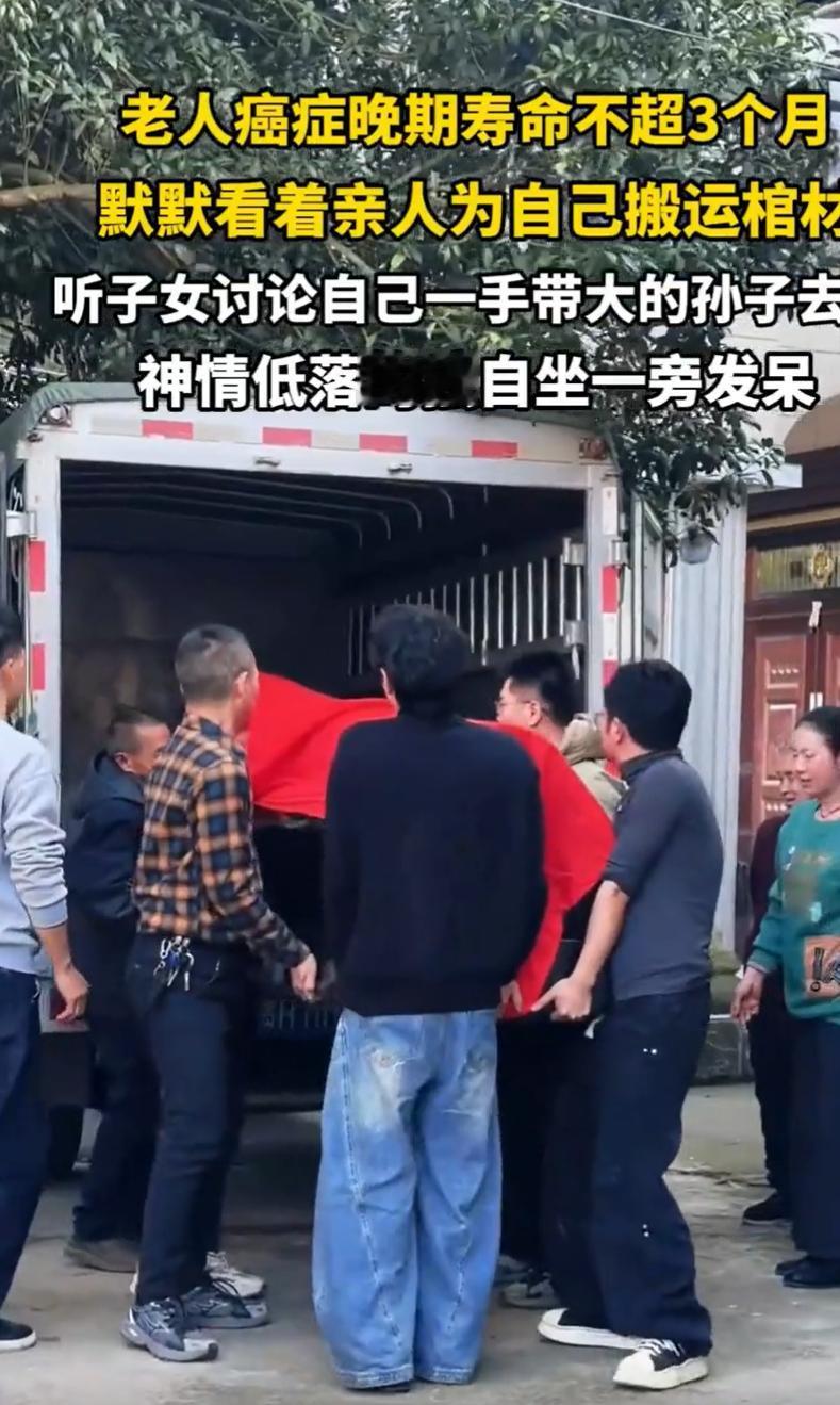 看的心酸!贵州,一老人癌症晚期,医生通知家人可以做准备工作了,回到家后,亲人也是相当上心,该准备的东西一样不差,而老人就这样默默看着亲人为自己搬运棺材,这样的场景还是让人看的心里很不舒服 视频里,老人就那么躺在沙发上,后来又挪到门口坐着,眼神一直往门外瞟。门外是什么?是晚辈们从车上往下抬棺材。虽然上面盖着红布,但谁都知道那是什么东西 老人就那么看着,一句话没说 屋里过年的气氛一点都没有,孩子们忍不住掉眼泪,大人沉默着忙进忙出。那种静,比嚎啕大哭还让人难受 有网友说:这家人一点都不顾及老人的感受么! 但也有网友表示:几十年前老人都是自己置办喜棺!估计是老人嘱咐儿女提前买回来看看的!有些老人对待死亡比较坦然的!不是老人坚持,儿女不会提前买回家的! 说实话,我觉得不顾及老人感受这话有点重,农村办白事的规矩多,很多事讲究时辰,不是说你想哪天办就哪天办。儿女们赶在过年前把东西备齐,可能也是想着趁大家都在,把该办的事办了,让老人安心。他们脸上没有笑容,沉默着做事,心里未必好受 真正扎心的不是那口棺材,是那种无力感 一家人围着一个即将离开的人,心里都清楚结局,但谁也不说破。孩子们忍不住哭,大人不让哭。老人看着儿女为自己忙活,想安慰两句,又不知道说什么。这种氛围,才是最无奈的 这事让我想起一句话:人这一生,除了生死,都是擦伤。但生死这件事,偏偏最没法准备。哪怕棺材摆在眼前,你也准备不好