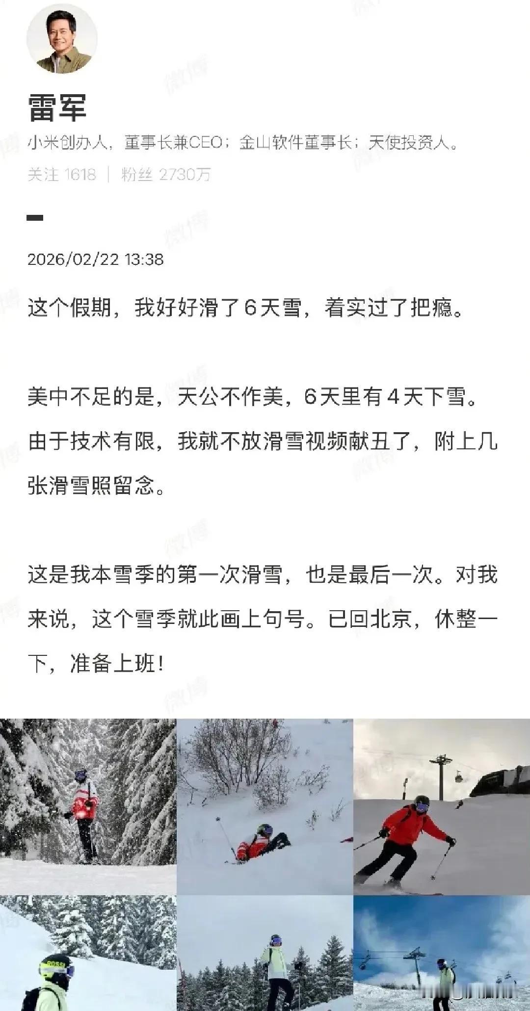 雷军,兴奋发文! 2月22日,很多人都还躺在家里刷手机,雷军却已经在雪场上"内卷"完了!今天下午他突然发文,字里行间那股兴奋劲儿隔着屏幕都能感受到——这个春节,他扎扎实实滑了6天雪,直言"过足了瘾"! 有意思的是,雷总这次还挺"可爱"。他坦白说6天里有4天都在下雪,本来想炫一下滑雪视频,结果因为"技术有限"没好意思放出来,只晒了几张照片。结果网友的评论更损:"雷总滑得咋样不知道,但这摄影师绝对是高手中的高手!" 说实话,看到这条动态我愣了一下。很多人可能不知道,雷军是个铁杆滑雪发烧友。据说当年那句火遍全网的"站在风口上,猪都能飞起来",就是他站在山顶时悟出来的!这次他还解锁了"滑野雪"新技能,看来是真爱。 不过雷军也说了,这是本雪季第一次也是最后一次滑雪,回京就要收心上班了。想想也是,57岁的人了,带着小米又是造车又是搞AI,能挤出6天放纵一下,已经很奢侈了。 看到这儿突然有点感触:不管是千亿大佬还是普通人,都需要这样一个"充电时刻"。滑完雪,休整一下,然后继续热爱生活。这个年,你给自己充电了吗?