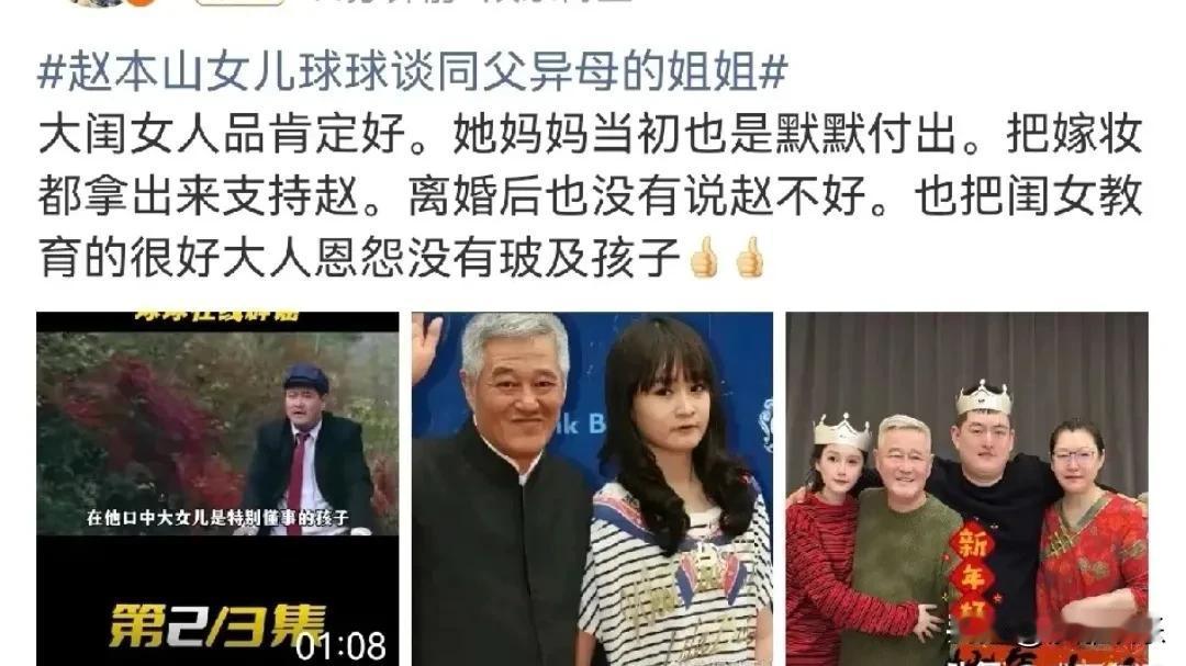 赵本山女儿,冲上热搜!!! 球球首谈同父异母姐姐:家里照顾一视同仁,她性格低调不愿曝光 2月22日,赵本山女儿球球在直播里,破天荒聊起了自己那个同父异母的姐姐。以前大家都只知道她有哥哥赵一楠,很少听她提家里其他孩子,这次她倒是没回避,直接把心里话掏出来跟粉丝说了 。 球球说,姐姐性格特别低调,压根不想沾“赵本山女儿”这个名的光,也不愿意在镜头前曝光。其实家里人对她们都是一视同仁,生活上照顾得挺周到,从没有说因为不是一个妈生的就厚此薄彼 。 说实话,这种大家庭在咱们外人看来,总觉得关系可能挺微妙。但听球球这口气,倒是挺真诚的,没有那种刻意秀姐妹情深的套路,就是实实在在的一句“都挺好”。 很多网友听完感慨,老赵家家风确实正,哪怕离过婚、哪怕不是一个妈,也没让孩子们心里结疙瘩 。其实老百姓过日子也是这样,一家人能不能处得好,不看有没有血缘,看的是有没有那份真心。给球球的这份坦诚点个赞,实在!