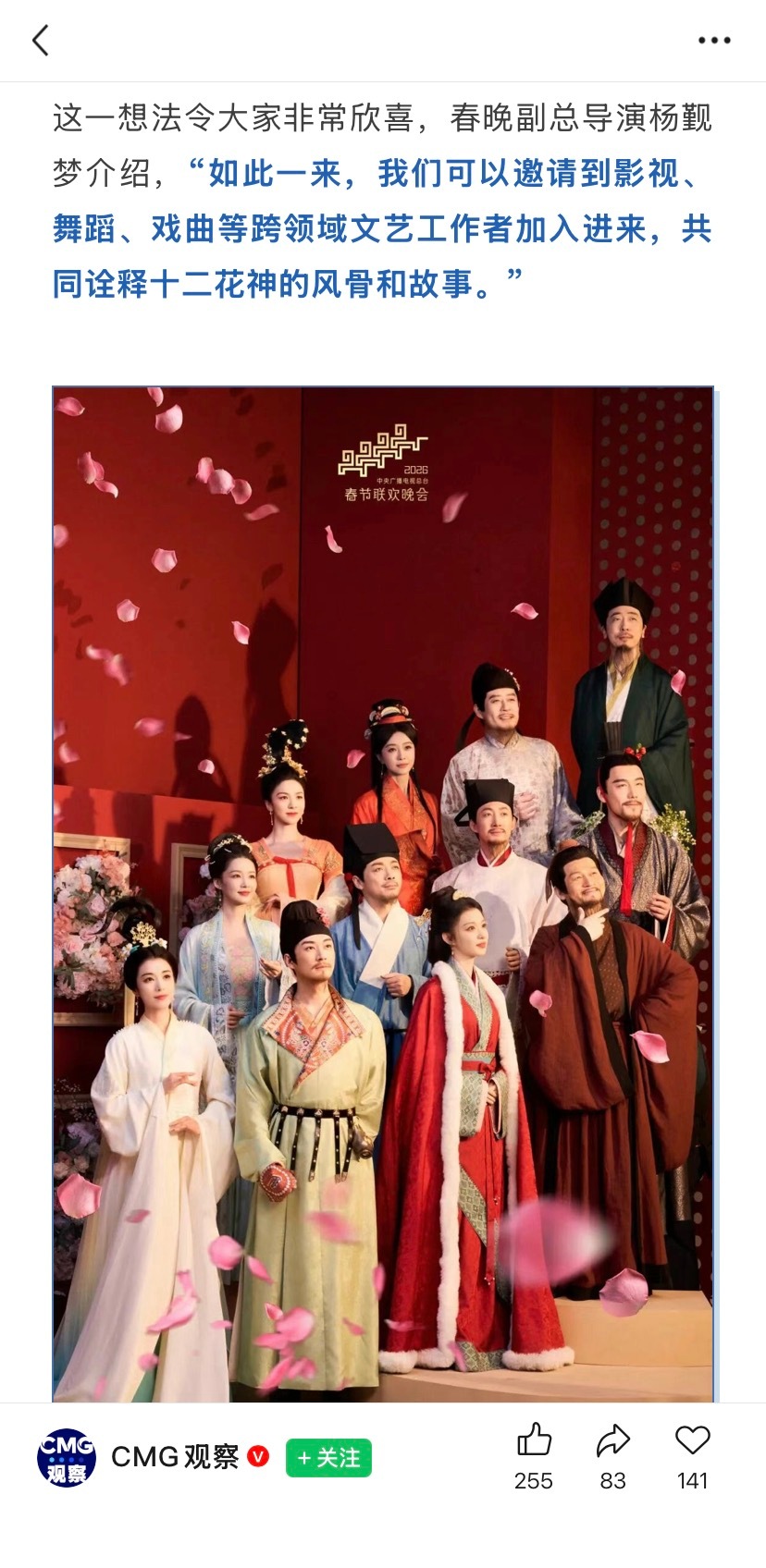 【“我们精心选择了十二位非常优秀的演员一起合作。在服化道的设计上,也依循历史记载外化他们的形象,同时在装扮上增加巧思点缀,成就了除夕的《贺花神》。”】