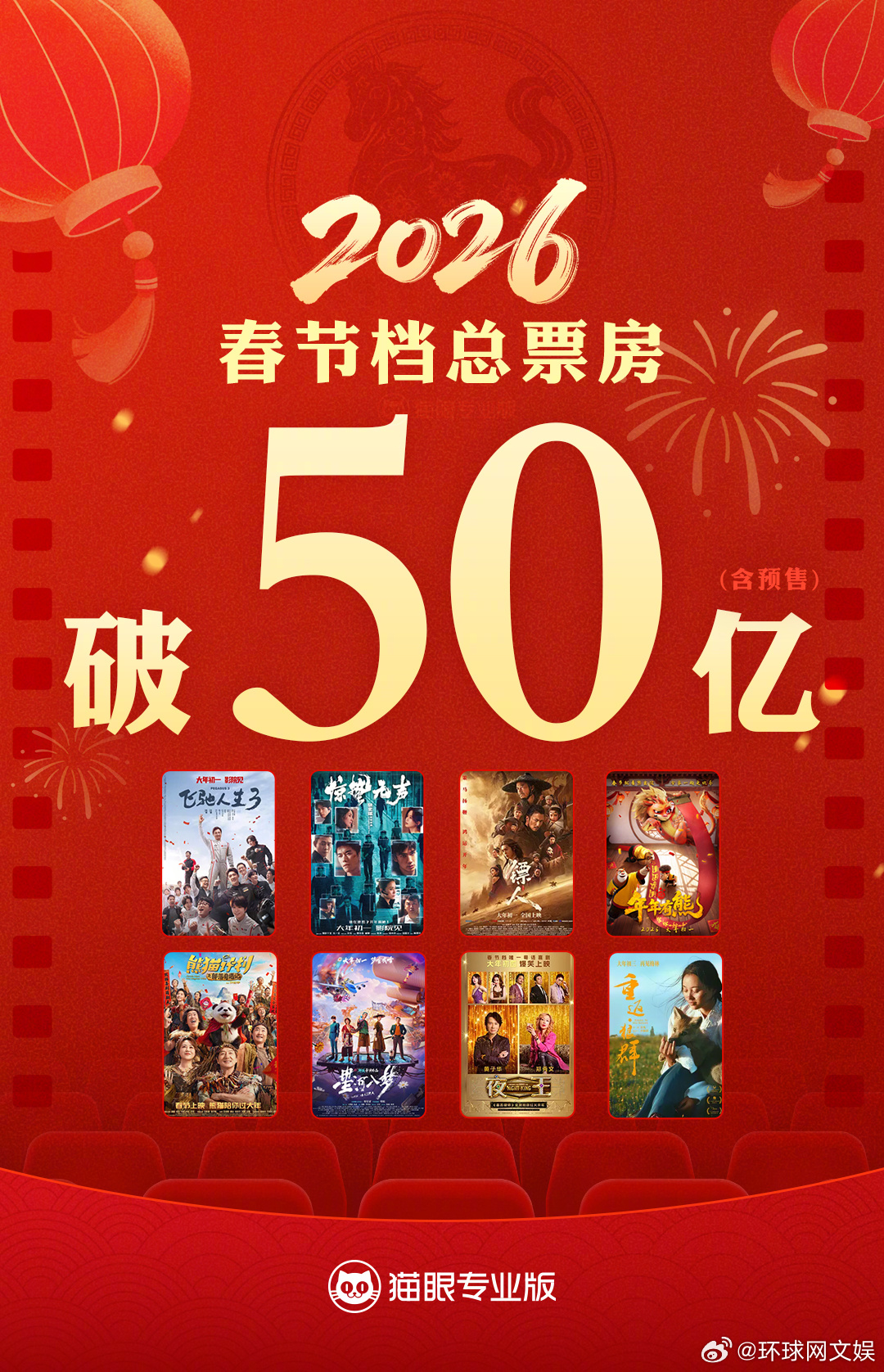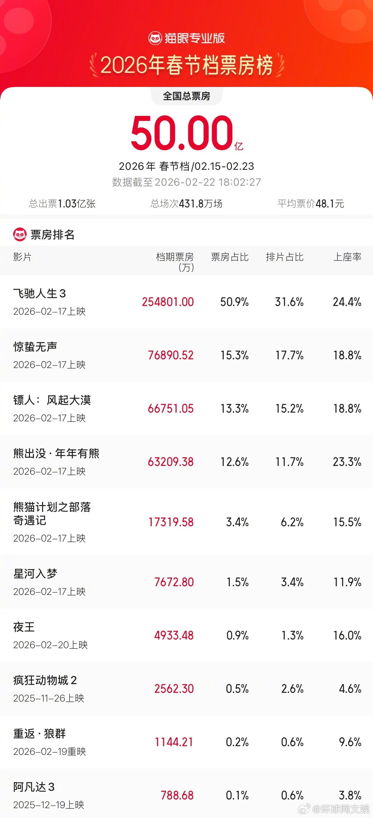 【#2026年春节档票房超50亿# 】据猫眼专业版数据,2026年春节档档期总票房(含预售)破50亿,《飞驰人生3》《惊蛰无声》《镖人:风起大漠》分列前三位。#2026春节档#