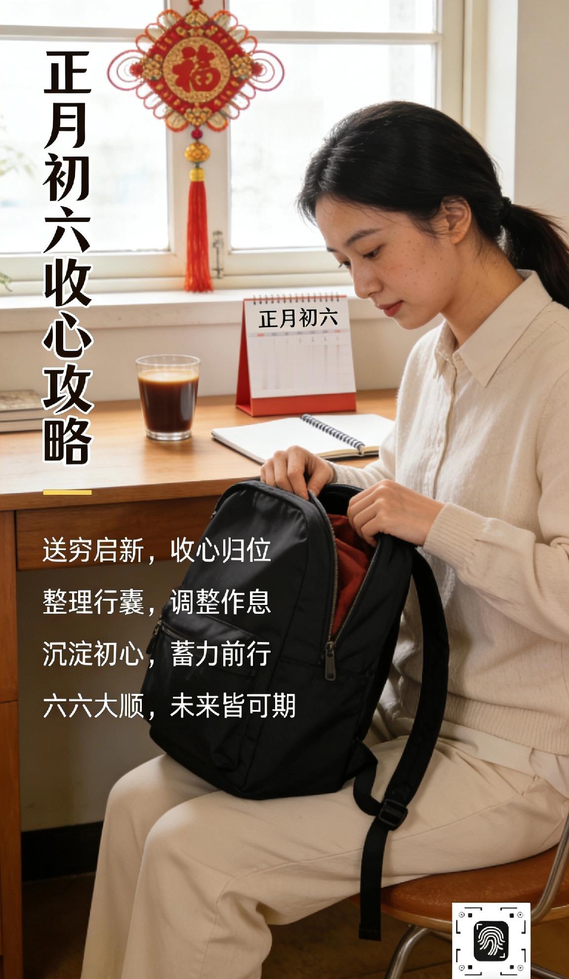 正月初六,送穷启新,正是收心归位时。 暂别假期的慵懒闲适,收拾散漫心绪,扫去浮躁与疲惫,让生活重回有序节奏。 整理行囊,调整作息,以清醒从容迎接新的奔赴;沉淀初心,蓄力前行,把松弛的状态收归饱满。 不负时光,不负自己,以昂扬姿态开启马年新程,愿收心即顺心,万事稳步向前,六六大顺,未来皆可期。