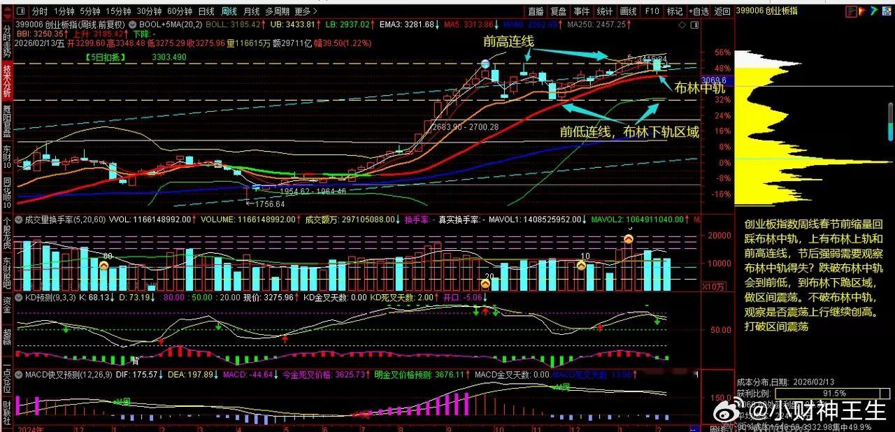 2026.2.22日周复盘。上证指数周线春节前缩量跌破5周均线,上和布林上轨太近,下有布林中轨和上升通道下轨支撑。节后观察上证指数周线是否继续回踩多空线BBI,或者蓝色通道下轨,只要指数还在前高连线上震荡,没有跌破布林中轨,指数多头趋势就没有改变。目前还是多头调整。上证指数日线节前跌破布林中轨,量缩到前低低量区域。节后观察2点,1点是能否重回布林中轨?2是继续下跌测试1低得失?创业板指数周线回踩布林中轨后在布林中轨上震荡。节后观察布林中轨得失?不破布林中轨,还有机会震荡上行。跌破布林中轨,回到区间震荡区,有机会再次测试前低连线,布林下轨区域。创业板指数日线节前布林中缩量震荡,布林轨道收口等待选择方向?向上观察能否突破通道上轨?向下观察是否再测通道下轨?沪深300指数周线节前回踩了布林中轨和蓝色通道下轨。节后观察指数缩量不破蓝色通道下轨。多放趋势还在,后续会震荡上行创高。日线节后观察布林下轨和通道下轨得失?不破1低。会继续震荡上行。