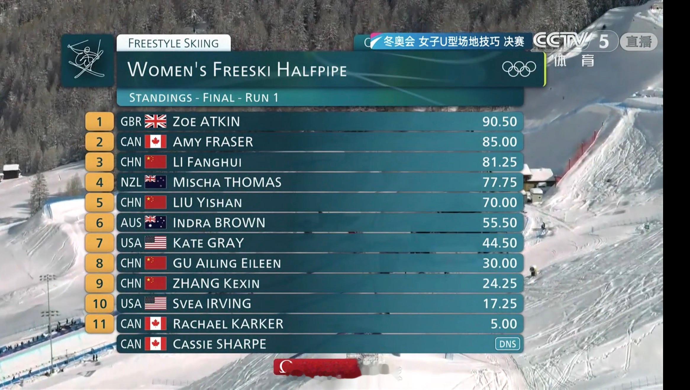 女子U型场地决赛第一轮战罢!中国选手李方慧目前排在第三位,刘奕衫排在第五位,谷爱凌赫张可欣分别位列八九名!