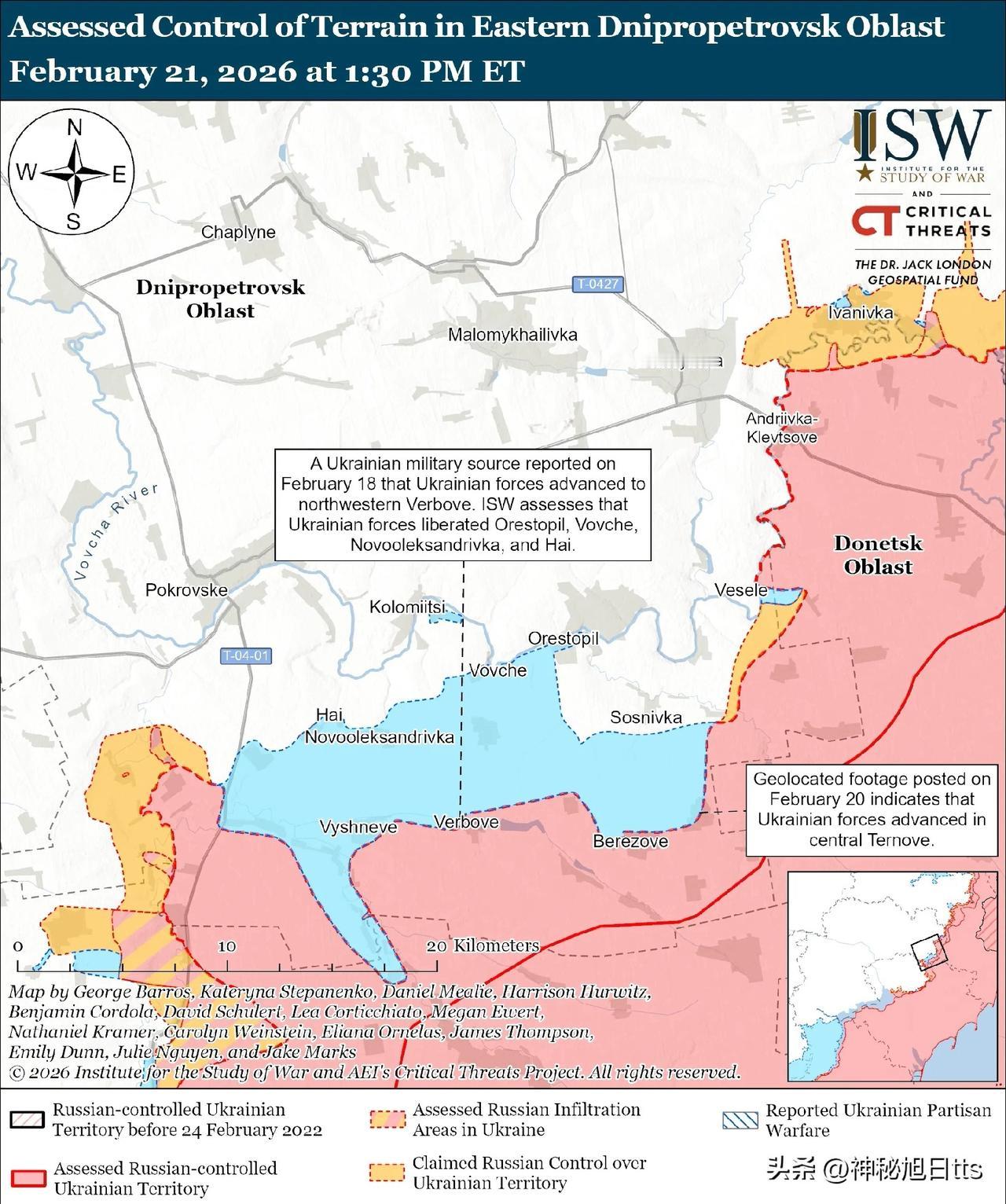 乌克兰军队继续坚守防线,击退俄军在乌克兰南部的推进。乌克兰总统泽连斯基在2月20日发表于法新社的采访中表示,乌克兰军队已在乌克兰南部某未指明的地区解放了300平方公里的领土。泽连斯基并未具体说明乌克兰军队近期推进的时间或确切地点,但法新社援引泽连斯基的话说,乌克兰军队正在“利用”这一局势,此前SpaceX公司封锁了俄军使用星链终端,而这些终端曾为乌克兰军队的推进提供了支持。 现有公开证据表明,乌克兰军队在最近几周解放了第聂伯罗彼得罗夫斯克州-扎波罗热州行政边界附近的多个居民点。ISW观察到的证据评估显示,自2026年1月1日以来,乌克兰军队已解放了乌克兰南部至少168.9平方公里的领土。一位与克里姆林宫有关联的俄罗斯军事博主于2月20日发布了一张地图,承认乌克兰军队已向新巴甫洛夫卡以东推进。ISW在2026年没有观察到任何视觉证据表明俄罗斯军队在新巴甫洛夫卡北部保持阵地,而2月20日发布的地理定位视频显示,乌克兰军队在新巴甫洛夫卡东部开展行动。2月20日发布的地理定位视频显示,乌克兰军队最近在捷尔诺韦中部(奥列克桑德里夫卡东南部)推进。 2月18日,一名乌克兰军方消息人士报告称,乌克兰军队已推进至韦尔博韦西北部,这表明乌克兰军队可能在不久前解放了奥列斯托皮尔、沃夫切、新列克桑德里夫卡和海伊(均位于列克桑德里夫卡东南方向)。[6] 随着更多信息的出现,ISW将继续完善其对地形评估的控制。