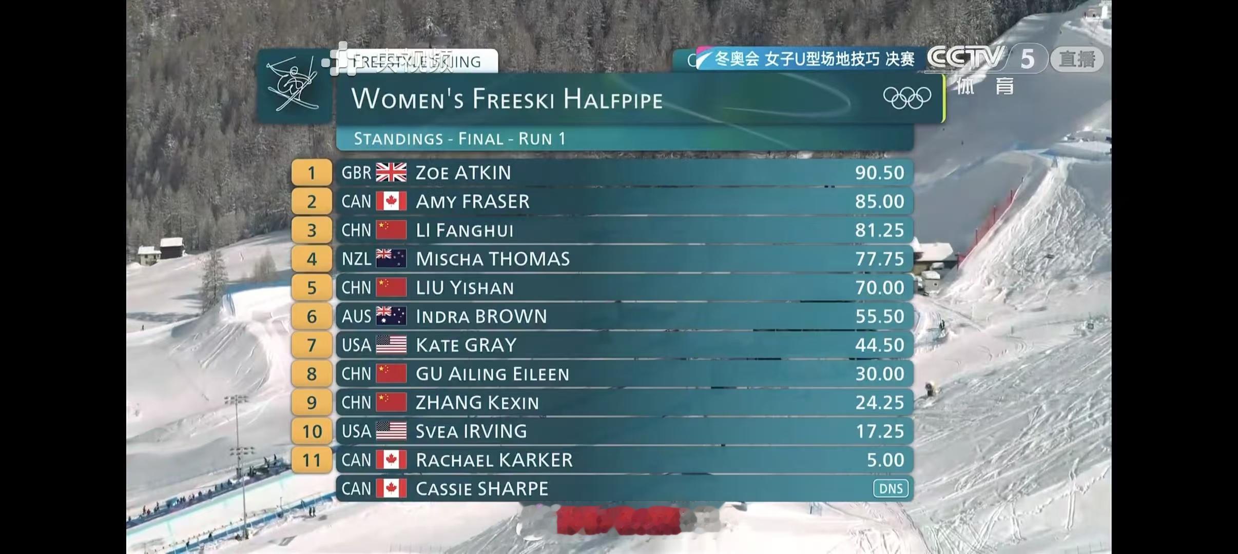 2026年米兰科尔蒂纳冬奥会 自由式滑雪女子U型场地技巧决赛第一跳后(一共3跳,取最高一跳)🇬🇧佐伊·阿特金90.50分🇨🇦埃米·弗雷泽85.00分🇨🇳李方慧81.25分🇳🇿米沙·托马斯77.75分🇨🇳刘奕杉70.00分🇦🇺因德拉·布朗55.50分🇺🇸格雷44.50分🇨🇳谷爱凌30.00分🇨🇳张可欣24.25分🇺🇸斯韦亚·欧文17.25分🇨🇦卡克尔5.00分🇨🇦夏普DNS