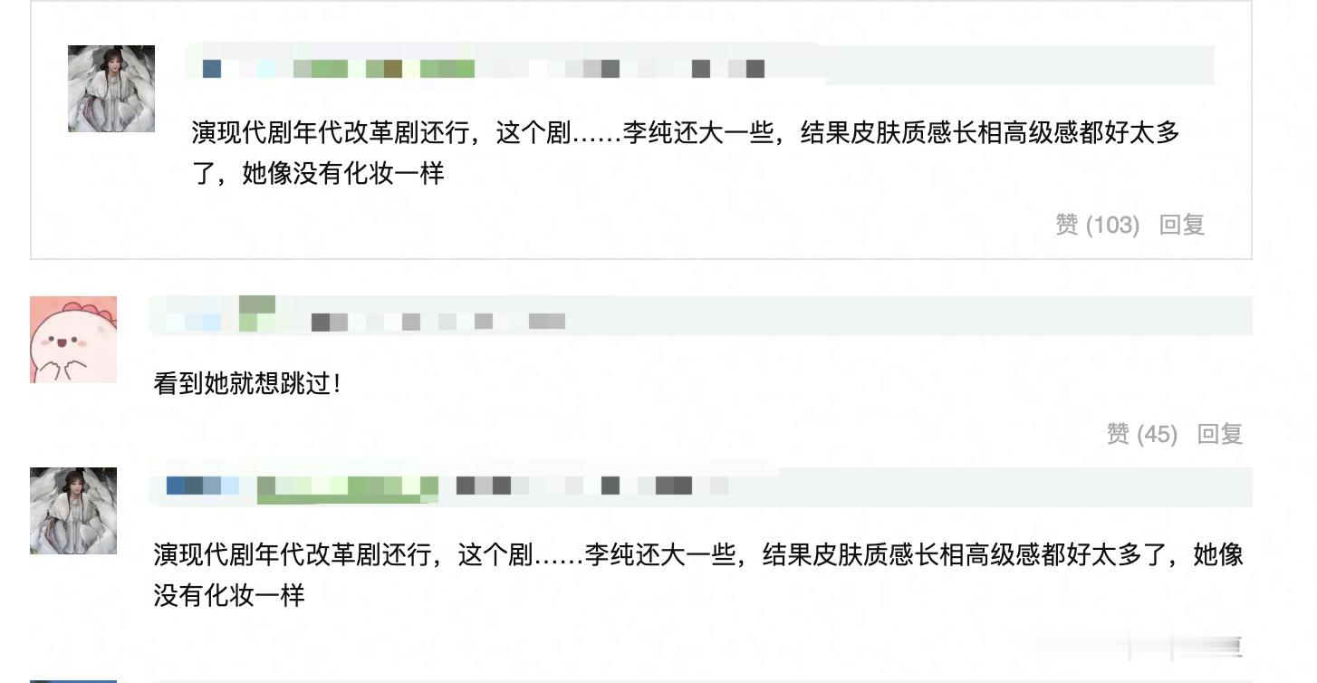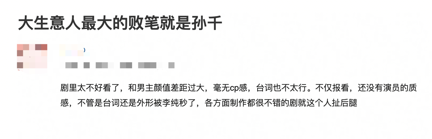 网友说孙千在《纯真年代的爱情》里被女二郭晓婷艳压了,还说她本身就不是漂亮类型,身材加分了,女二郭晓婷演技比她灵动多了。在大生意人里也被网友吐槽和陈晓没有cp感,很违和,被李纯外形和台词秒了。还有的网友说她太现代感,应该多接点现代剧。你们怎么看?