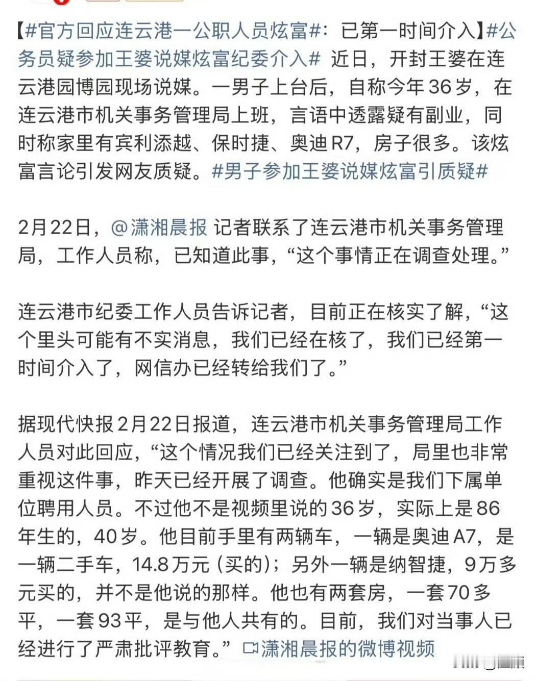 40岁还没老婆,公开场合吹牛炫富,上级单位调查结果来了: 1.是机关事务局下属单位聘用人员。 2.有2辆车,一辆9万,一辆二手奥迪14.8万。 3.与他人共有2套房,一套70平,一套93平。 之前说什么宾利添越、保时捷、奥迪R7,房子很多,牛皮都吹上天了。 这种人平时是不是脑子有点异常?