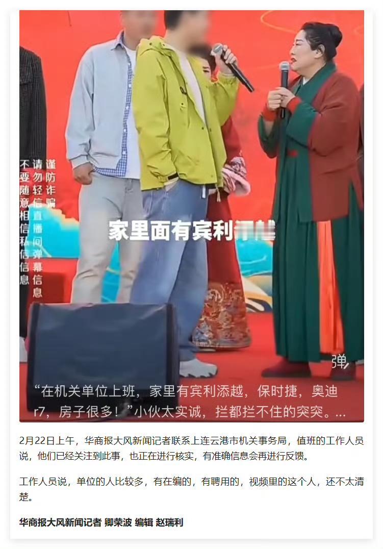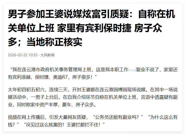 上开封王婆说媒节目的连云港小伙,百分之百没有吹牛。36岁跑去相亲,既是想找对象,更是想借这个平台炫富。家里库里南、保时捷等豪车云集,最差的也是奥迪R7,家里还有众多房产,这显然是家里有,才能情不自禁的说出来,而不是瞎编。连云港机关事务局工作,不确定是不是公务员编制,有副业。